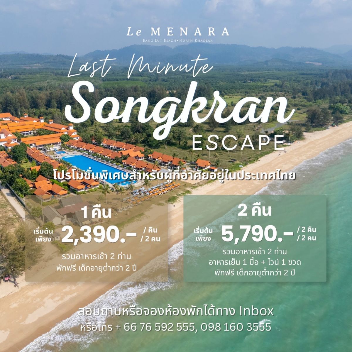 สำหรับโปรโมชั่นสงกรานต์ Le Menara Khao Lak – Last Minute Songkran Escape เริ่มตั้งแต่วันที่ 10-19 เมษายน 2569) สามารถสอบถามหรือจองห้องพักได้ทาง Inbox หรือโทร. + 66 76 592 555, 098 160 3555