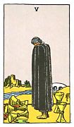 อิทธิพลของไพ่ 5 ถ้วย (Five of Cups) คุณจะเริ่มเบื่อหน่ายกับคนรัก เหตุเพราะเริ่มพูดกันไม่รู้เรื่อง ดังนั้นควรปรับใเข้าใจกันก่อนจะเเย่กว่านี้ ด้านการเงินจะมีโชคลาภเข้ามาอย่างไม่คาดฝัน ทำให้เงินทองเริ่มหมุนได้คล่องมือ แต่บางรายจะมีเหตุเสียเงิน เพราะเรื่องสุขภาพ ด้านการงานต้องนิ่งให้มาก เพราะมีคนคอยเล่นงานอยู่ สำหรับคนที่มีงานส่วนตัว กิจการเริ่มมีปัญหา เพราะบริวารทำเหตุ ช่วงนี้ควรทำบุญทำทานตามโอกาสอันควร จะเสริมชะตาชีวิตเราให้ดีขึ้น