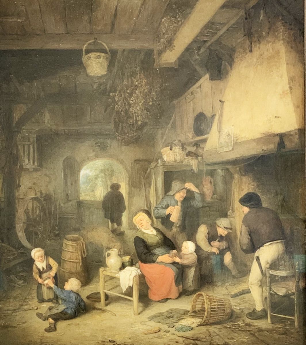 Peasant Family at an Inn โดย Adriaen van Ostade เขาเกิดที่ Haarlem ในวันที่ 10 ธันวาคม 1610 โดยเป็นบุตรคนโตของ Jan Hendricx Ostade เขาเข้าเรียนศิลปะกับ Frans Hals ในปี 1627 เขาย้ายไปอยู่ Utrecht ในปี 1632 ก่อนย้ายกลับมา Haarlem และร่วมกับกลุ่มช่าง Haarlem Guild of St. Luke ก่อนแต่งงานเมื่ออายุได้ 28 ปี แต่ภรรยาของเขาเสียชีวิตในอีก 2 ปีต่อมา เขาแต่งงานอีกครั้ง แต่ก็กลายเป็นหม้ายอีกในเวลาไม่นาน เขาเลยเลิกสนใจเรื่องผู้หญิงแล้วหันมาเปิดห้องเรียนและรับนักศึกษามาร่วมทำงานและส่งเสริมให้พวกเขากลายเป็นศิลปินที่มีชื่อเสียงในเวลาต่อมาอีกหลายคน ปี 1662 เขาลงทะเบียนเป็นผู้ดูแลวัด St. Luke และได้กลายเป็นช่างที่ฮาเร็ม