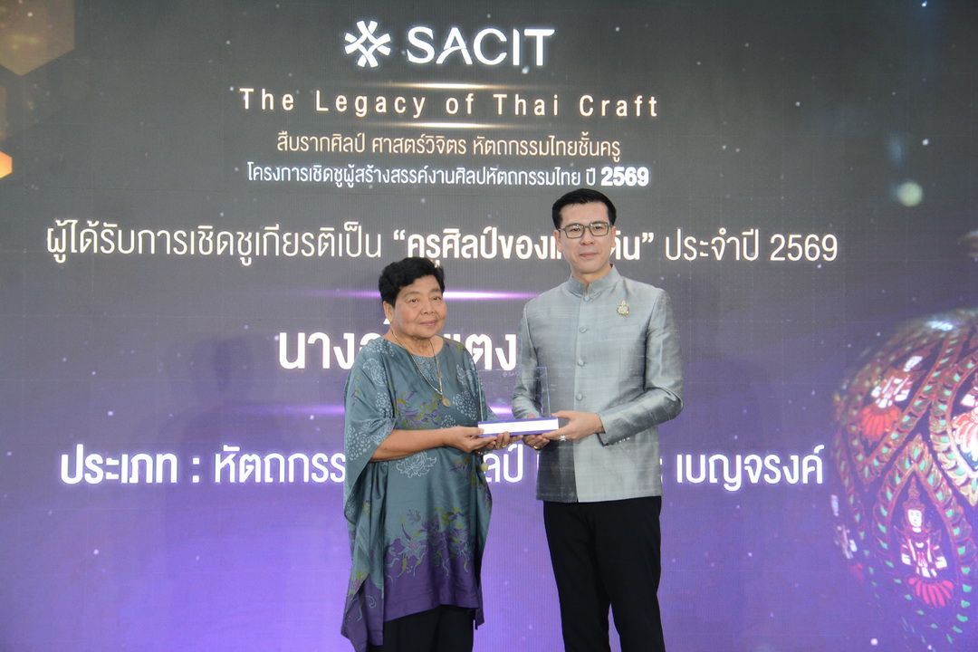 20 เมษายน 2569 สถาบันส่งเสริมศิลปหัตถกรรมไทย (องค์การมหาชน) หรือ SACIT (สศท.) จัดพิธีมอบโล่เชิดชูเกียรติ “ผู้สร้างสรรค์งานศิลปหัตถกรรมไทย ประจำปี 2569” ณ บ้านปาร์คนายเลิศ เพื่อยกย่องบุคคลผู้เป็นที่สุดแห่งงานศิลปหัตถกรรมไทย รวม 22 ท่าน นำโดย 5 ครูศิลป์ของแผ่นดิน ผู้สืบทอดงานผ้าไทยและประณีตศิลป์ระดับ Masterpieces ที่หาชมได้ยากยิ่ง พร้อมประกาศยุทธศาสตร์ดันงานฝีมือไทยก้าวสู่สากล
