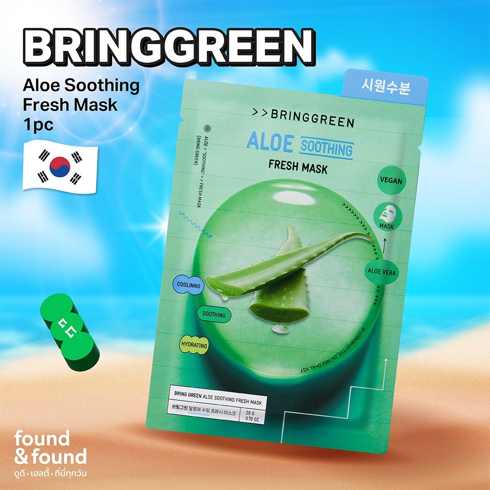 BRINGGREEN Aloe Soothing Fresh Mask แผ่นมาสก์หน้าที่อุดมไปด้วยสารสกัดจากว่านหาง จระเข้และใบมิ้นท์ป่า ช่วยเติมความชุ่มชื้นให้กับผิวที่ขาดน้ำ มอบความเย็นสดชื่นทันทีหลังใช้ และขอแนะนำอีกหนึ่งไอเทมน่าลอง Innisfree Squeeze Energy Mask Aloe แผ่นมาสก์วีแกนเข้มข้นพร้อมเอสเซนส์บำรุงสูตรอ่อนโยน ช่วยปลอบประโลมพร้อมมอบความผ่อนคลายและเติมความชุ่มชื้นให้ผิวหน้าที่อ่อนล้า
