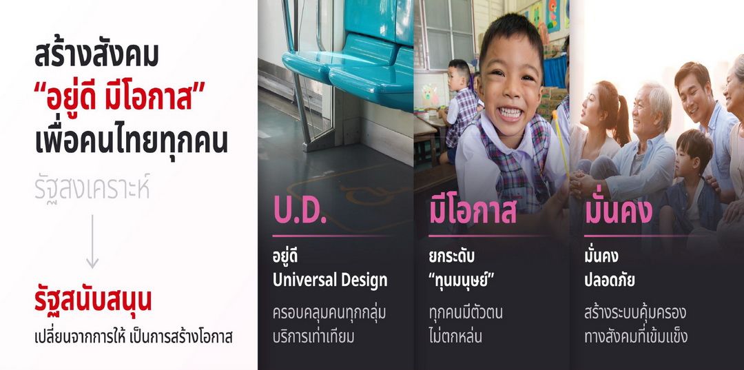 4) ด้านชุมชนเข้มแข็ง ด้วยการปรับบทบาทการทำงานในพื้นที่ให้เป็นการทำงานร่วมกับทุกภาคส่วน โดยใช้กลไก "ทีมสร้างสุข" และผลักดันการจัดตั้ง “ศูนย์สร้างสุข" ให้ครอบคลุมทุกอำเภอทั่วประเทศ ควบคู่กับการส่งเสริมความเข้าใจในความหลากหลาย การอยู่ร่วมกันด้วยความเข้าใจและเกื้อกูล ทั้งความหลากหลายทางเพศทางชาติพันธุ์ หรือความแตกต่างของคนพิการ และเสริมสร้างความเข้มแข็งของชุมชน ให้สามารถพึ่งพาตนเองได้อย่างยั่งยืน รวมถึงส่งเสริมการปรับสวัสดิการที่มีเหมาะสมของกลุ่มเปราะบางทุกกลุ่ม ทั้งครอบครัวที่ให้กำเนิดบุตร ผู้สูงอายุวัยเกษียณ และคนพิการกลุ่มต่างๆ
