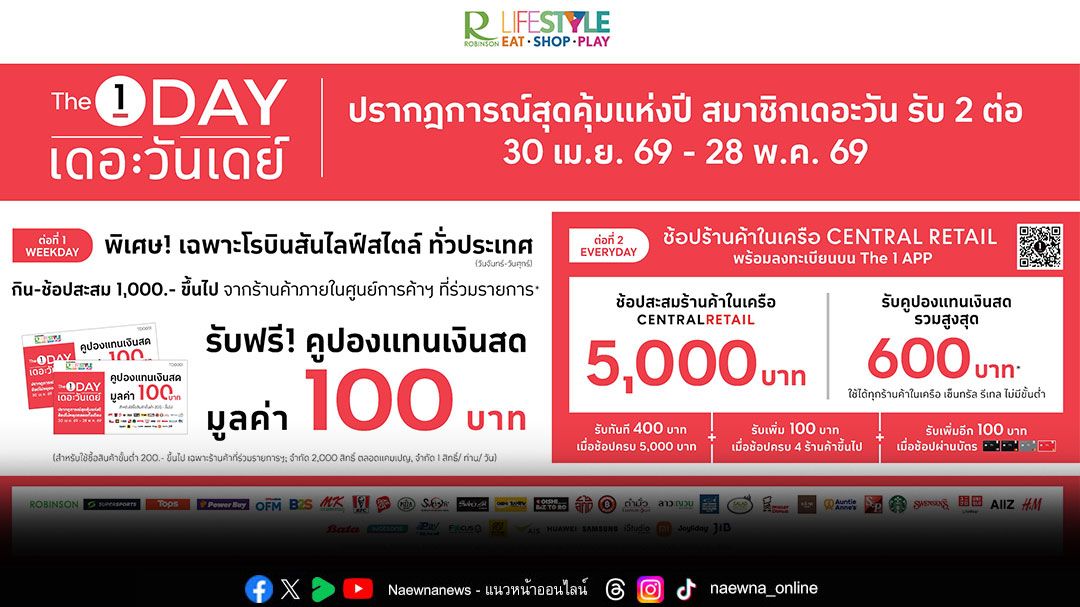 ศูนย์การค้าโรบินสันไลฟ์สไตล์ ในเครือเซ็นทรัล รีเทล ร่วมกับ The 1 เปิดตัวโปรโมชันสุดเอ็กซ์คลูซีฟ “The 1 Day” ปรากฏการณ์สุดคุ้มแห่งปี ที่ยกระดับความคุ้มค่าในทุกการใช้จ่ายจากร้านค้าภายในศูนย์การค้าฯ และแบรนด์พันธมิตรในเครือเซ็นทรัล รีเทล ตอกย้ำบทบาทของโรบินสันไลฟ์สไตล์ในฐานะศูนย์กลางชีวิตของทุกคน หรือ Central to Life ที่พร้อมตอบโจทย์ทั้งการกิน ช้อป และการใช้เวลาร่วมกันในครอบครัว ผ่านสิทธิพิเศษที่เข้าถึงได้ง่ายและคุ้มค่า ตั้งแต่วันที่ 30 เม.ย. 69 – 28 พ.ค. 69 ที่โรบินสันไลฟ์สไตล์ทุกสาขา ทั่วประเทศ