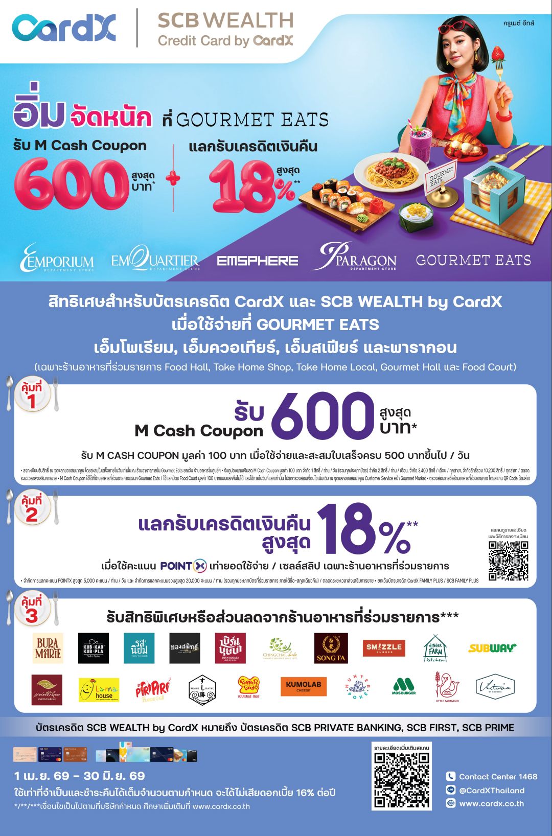 สำหรับแคมเปญ อิ่มจัดหนัก ที่กูร์เมต์ อีทส์ ลูกค้าผู้ถือบัตรเครดิต CardX และ SCB WEALTH by CardX สามารถรับสิทธิประโยชน์ได้ 3 ต่อ