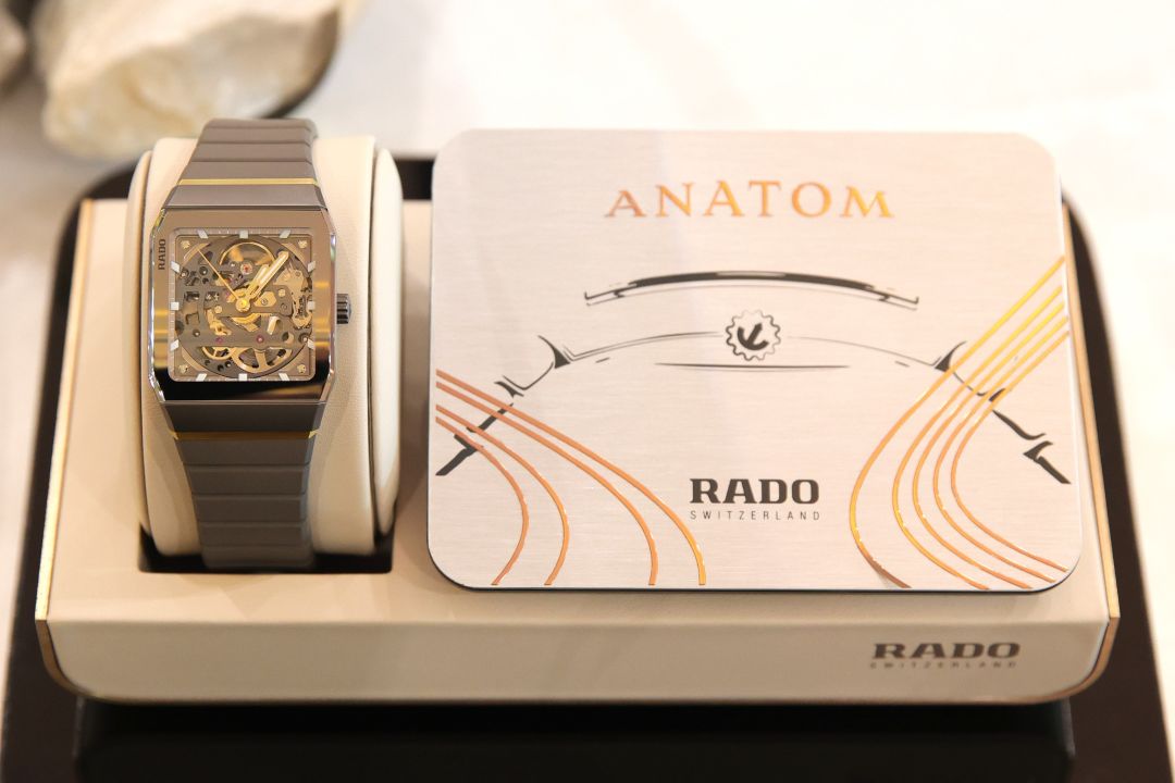อีกหนึ่งเรือนไฮไลต์ของปีนี้มาจากตระกูล อะนาตอม (Anatom) ในรุ่น อะนาตอม ออโตเมติก สเกเลตัน (Anatom Automatic Skelton) ซึ่งสะท้อนแนวคิดการออกแบบเชิงนวัตกรรมของ ราโด (Rado) ได้อย่างชัดเจน โดยสืบทอดดีไซน์อันเป็นเอกลักษณ์ตั้งแต่ปี 1983 และได้รับการตีความใหม่ด้วยโครงสร้างแบบสเกเลตันเป็นครั้งแรกของตระกูล เผยให้เห็นกลไกออโตเมติกคาลิเบอร์ R808 ที่มาพร้อมพลังงานสำรอง 80 ชั่วโมง และแฮร์สปริงนิวาครอง (Nivachron™) ตัวเรือนยังคงรูปทรงโค้งรับข้อมือตามหลักกายวิภาค ผสานวัสดุไฮเทคเซรามิก และสแตนเลสสตีลอย่างลงตัว พร้อมรายละเอียดหน้าปัดและองค์ประกอบที่เน้นมิติของกลไกอย่างประณีต