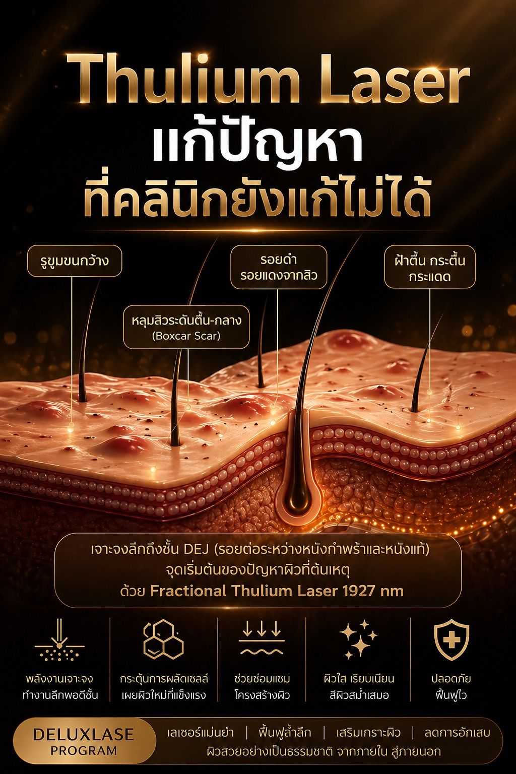 ที่ผ่านมาการแก้ปัญหาชั้นนี้ มักต้องใช้การฉีด skin booster หรือ growth factor ที่ราคาสูง แต่ปัจจุบันมีเลเซอร์ที่ยิงตรงชั้นนี้ได้คือ Fractional BB Laser Thulium เลเซอร์ความยาวคลื่น ~1927 nm ที่ถูกออกแบบมาให้ทำงานพอดีกับผิวชั้นตื้น + รอยต่อ DEJ ซึ่งการยิงแบบ Fractional (จุดเล็กๆ จำนวนมาก) จะลงลึกแบบพอดีชั้น พร้อมกระตุ้นการผลัดเซลล์ผิว ซ่อมโครงสร้างผิว เรียกง่าย ๆ คือ รีเซ็ตผิวใหม่จากฐาน