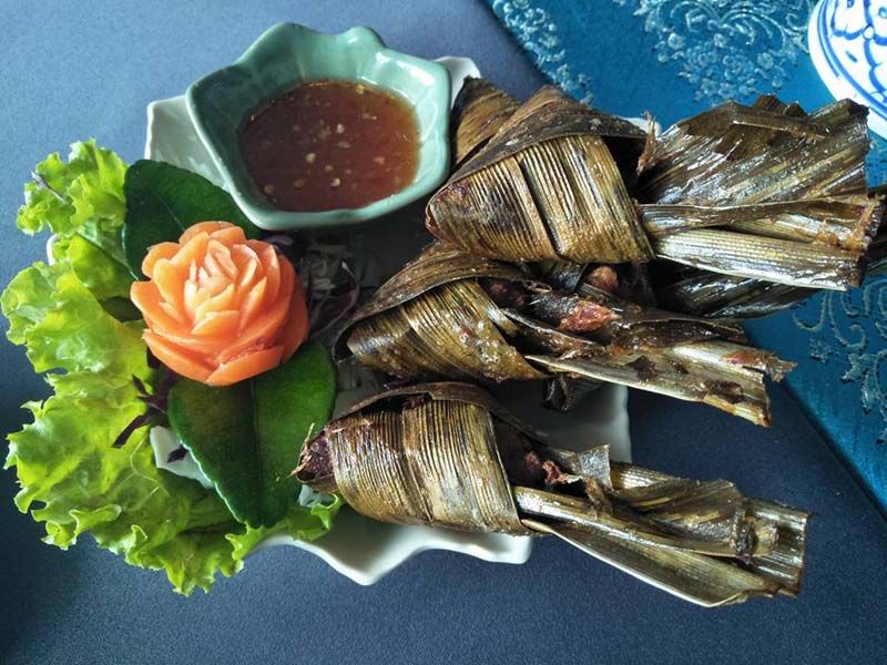 อีกเมนูหนึ่งที่แม่ครัวโชว์ให้ดู และเป็นเมนูที่ลูกค้าสั่งมากไม่แพ้ “ปูนิ่มหลน” คือ “ไก่ห่อใบเตย” เมนูนี้ดูจะมีเสน่ห์ตรงความหอมของเป็นเตย และความแปลกตานั้นเอง ส่วนผสมของเมนูนี้ ก็จะเป็นไก่เนื้อหั่นพอคำหมักด้วย ซอสปรุงรส กระเทียม ผงกระหรี่ รากผักชี นาน 1 คืน เพื่อให้ได้รสชาติเข้มข้น จากนั้นก็นำมาห่อกับใบเตย ...ใช้ใบเตยสดเพียงใบเดียวห่อไก่ที่หมักไว้ แล้วนำไปทอดในน้ำมัน ให้ท่วมไก่เพื่อให้สุกทั่วถึง จากนั้นก็ยกเสิร์ฟรับประทานคู่กับน้ำจิ้มไก่ เพิ่มรสชาติหวานจากน้ำจิ้ม อร่อยไปอีกแบบ