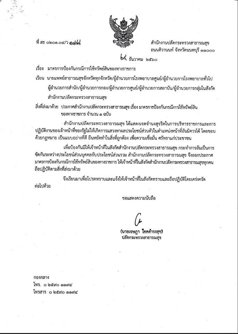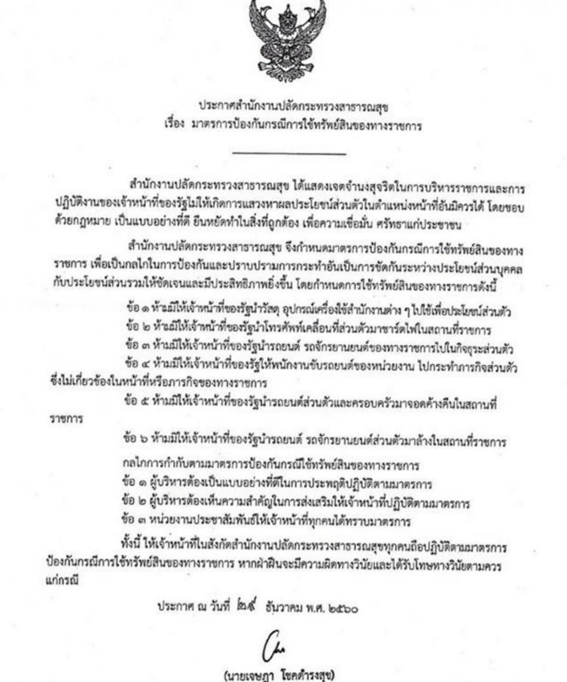 5 ม.ค. 2561 โลกออนไลน์มีการแชร์ประกาศสำนักงานปลัดกระทรวงสาธารณสุข เรื่อง มาตรการป้องกันกรณีการใช้ทรัพย์สินของทางราชการ ซึ่งเป็นหนังสือคำสั่งเลขที่ สธ. 0201.04/ว 3784 และมี นพ.เจษฎา โชคดำรงสุข ปลัดกระทรวงสาธารณสุข ลงนามเมื่อ 29 ธ.ค. 2560 โดยเนื้อหาระบุว่า ห้ามเจ้าหน้าที่รัฐนำทรัพย์สินของทางราชการทุกประเภท รวมถึงเครื่องมือเครื่องใช้สำนักงานไปใช้ประโยชน์ส่วนตัว ห้ามนำโทรศัพท์มือถือมาชาร์จกระแสไฟฟ้าในสถานที่ราชการ รวมถึงห้ามนำยานพาหนะส่วนตัวมาจอดค้างคืน หรือแม้แต่นำมาล้างในสถานที่ราชการด้วย