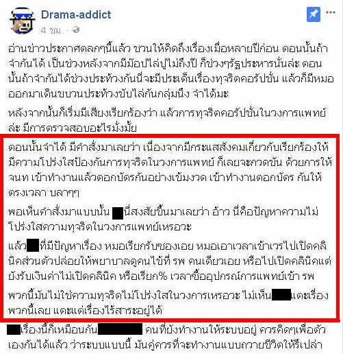 เช่นเดียวกับแฟนเพจ "Drama-addict" หรือจ่าพิชิต ขจัดพาลชน ซึ่งเป็นเพจของ นพ.วิทวัส ศิริประชัย อดีตแพทย์ประจำ รพ.เกาะลันตา อ.เกาะลันตา จ.กระบี่ ตั้งคำถามถึงนโยบายป้องกันการขัดกันแห่งผลประโยชน์ส่วนรวมกับส่วนตัว ที่เป็นเหตุผลในการออกประกาศดังกล่าวว่าสมเหตุสมผลหรือไม่ เมื่อเทียบกับเรื่องอื่นๆ ที่ร้ายแรงกว่า เช่น การเรียกรับผลประโยชน์จากผู้มารับบริการหรือเมื่อจะมีการซื้ออุปกรณ์เข้า รพ. การเอาเวลาเข้าเวรไปเปิดคลินิกส่วนตัว หรือไปเปิดคลินิกแต่ยังรับเงินค่าไม่เปิดคลินิก ที่ไม่ค่อยถูกพูดถึงในแวดวงคนสาธารณสุขเท่าที่ควร