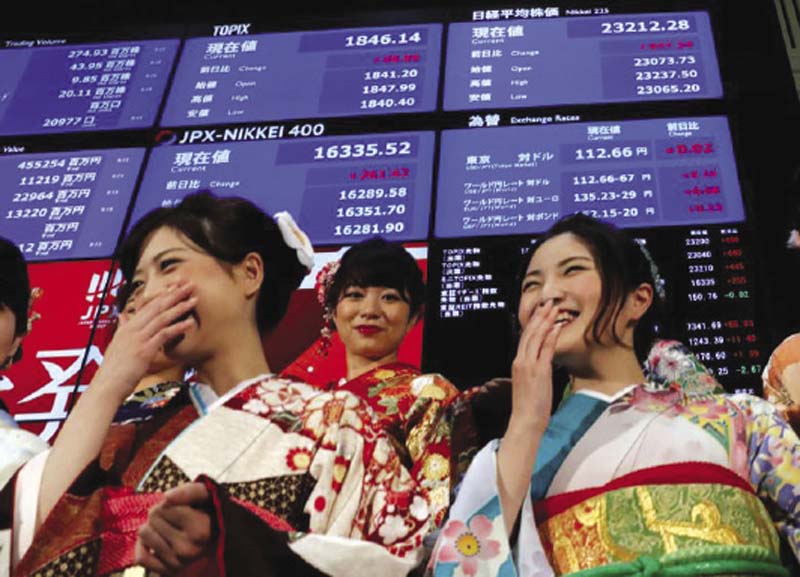 คิกคัก : สาวๆ ญี่ปุ่นในชุดกิโมโนแสนน่ารัก พากันหัวเราะคิกคักด้วยความเขินอาย ระหว่างยืนให้ช่างภาพถ่ายรูปด้านล่างจอแสดงดัชนีหุ้นนิกเกอิ ในวันแรกของการซื้อขายหุ้นตลาดหลักทรัพย์ญี่ปุ่นประจำปี 2018 ที่ตลาดหลักทรัพย์ในกรุงโตเกียว ประเทศญี่ปุ่น