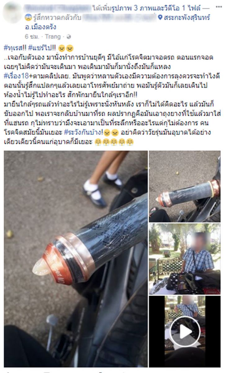 มายืนใกล้ๆรถแล้วทำอะไรไม่รู้เพราะนั่งหันหลัง เราก็ไม่ได้คิดอะไร แล้วมันก็ขับออกไป พอเราจะกลับบ้านมาที่รถ ผลปรากฏคือมันเอาถุงยางที่ใช้แล้วมาใส่ที่แฮนรถ กุไม่ทราบว่ามึงจะเอามาเป็นที่ระลึกหรืออะไรแต่กุไม่ต้องการ คนโรคจิตสมัยนี้มันเยอะ #ระวังกันบ้าง! อย่าคิดว่าวัยรุ่นมันอุบาดได้อย่างเดียวเดียวนี้คนแก่อุบาดก็มีเยอะ