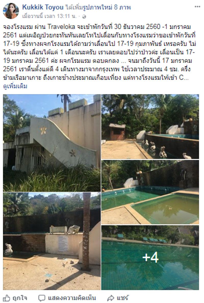 เจ้าตัวจึงได้ขับรถเข้าไปดูโรงแรมก่อน แต่สิ่งที่เจอถึงกับช็อก เพราะสภาพโรงแรมไม่ได้เป็นอย่างที่มีภาพโฆษณาในเว็บไซต์ เมื่อโทรสอบถามไปยังผู้จัดการโรงแรมก็ได้รับคำตอบว่า ปิดปรับปรุง และไม่มีการขอโทษ โดยเจ้าตัวระบุว่า ที่โพสต์ไม่ได้ต้องการอะไร แค่อยากแชร์เตือนเท่านั้น