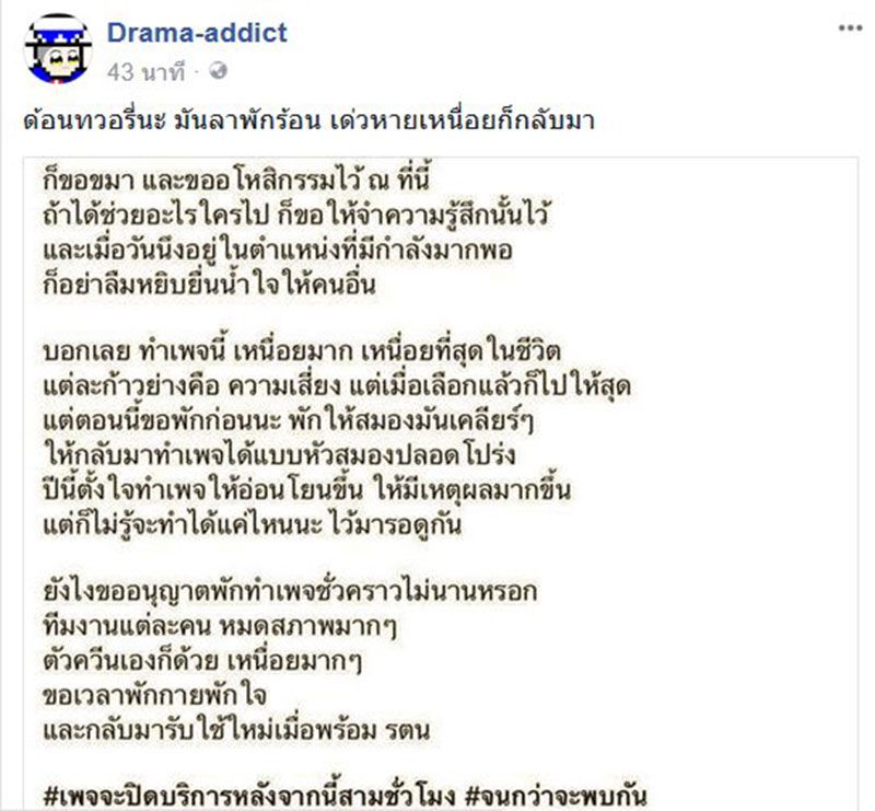 "อีกไม่กี่วันก็จะครบรอบ 1 ปีในการทำเพจแหม่มโพธิ์ดำ หากตนทำผิดพลาดหรือส่งผลกระทบต่อใครก็ขอขมาและขออโหสิกรรมไว้ ณ ที่นี้ด้วย ถ้าตนได้ช่วยใครไปก็ขอให้จำความรู้สึกนี้ไว้ เมื่อวันหนึ่งอยู่ในตำแหน่งที่มีกำลังมากพอก็อย่าลืมหยิบยื่นน้ำใจให้คนอื่น การทำเพจเฟซบุ๊กเหนื่อยมาก แต่ละก้าวคือความเสี่ยง แต่ตอนนี้ตนขอพักก่อน ทีมงานแต่ละคนก็หมดสภาพมาก ตนตั้งใจว่าในปีนี้จะกลับมาทำเพจให้อ่อนโยนมากขึ้น และมีเหตุผลมากขึ้น แต่ก็ไม่รู้จะทำได้แค่ไหน ต้องมารอดูกัน"