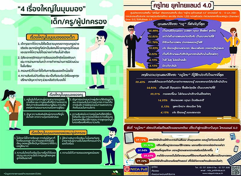 ผลโพลล์ต่อมา ศูนย์สำรวจความคิดเห็น สถาบันบัณฑิตพัฒนบริหารศาสตร์ (NIDA Poll) ในหัวข้อ “ครูไทย ยุคไทยแลนด์4.0” สำรวจความคิดเห็นจากประชาชนกลุ่มตัวอย่าง จำนวน 1,253 คน ระหว่างวันที่ 10-12 ม.ค. 2561 พบว่า 1.สังคมไทยอยากได้ “ครูดี” ก่อน “ครูเก่ง” โดยคุณสมบัติของครูบาอาจารย์ที่กลุ่มตัวอย่างต้องการ 3 อันดับแรก อันดับ 1 ร้อยละ 26.98 ตอบว่า เป็นคนดีมีคุณธรรม (เมตตา กรุณา ซื่อสัตย์สุจริต)รองลงมา ร้อยละ 22.82 เอาใจใส่ ในการสอนอย่างจริงจังเป็นแบบอย่างที่ดี และอันดับ 3 ร้อยละ 21.79 มีทักษะในการสอน ถ่ายทอดความรู้ได้ดี