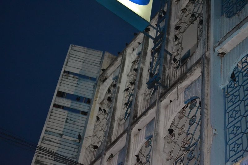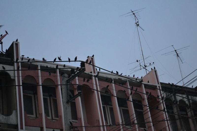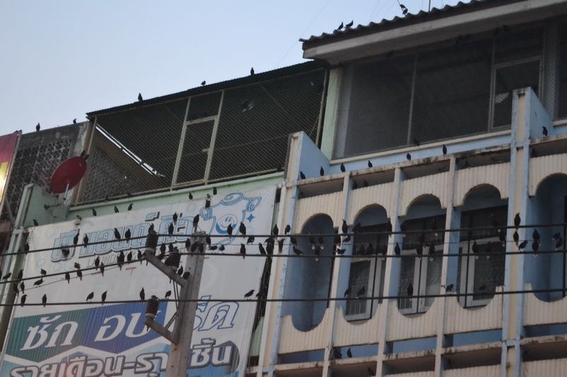 ขณะที่ คุณป้าลออ แม่ค้าขายขนมในตลาดแม่กลอง ซึ่งเข็นรถขายขนมผ่านมา ได้เล่าให้ฟังว่า เดิมนกเอี้ยงดำฝูงใหญ่นี้ อาศัยอยู่ที่หน้าสวนสุขภาพของเทศบาลเมืองสมุทรสงคราม ด้านศาลหลักเมือง แต่เมื่อไม่นานมานี้ หม้อแปลงไฟฟ้าเกิดระเบิด คงใกล้ที่อยู่อาศัยของพวกมัน ก็เลยตกใจ พากันอพยพมาอยู่ตรงนี้ แต่ไม่คิดว่ามันจะมากันมากขนาดนี้ นึกว่าจะมีสัก 100-200 ตัว แต่เห็นตรงนี้มีเป็นพันๆคัว น่ากลัวมาก