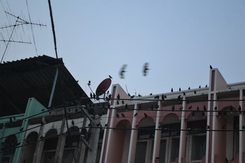 นอกจากส่งเสียงดัง เหมือนทักทายกันแล้ว นกบางตัว ยังบินไปบินมา เหมือนหาที่นอนพัก หรือทักทายเพื่อน ที่มาพบกันโดยมินัดหมาย ที่สังเกตได้อีกอย่างหนึ่งมูลนกหรือขี้นกจะหยดลงมาเป็นทางตามแนวสายไฟที่นกเอี้ยงเกาะ หรือตามมุมตึก ใต้ป้ายโฆษณา ร้านค้า ใต้จานรับสัญญาณทีวี ถ้าใครเดินผ่านไปผ่านมา หากไม่ระวัง ก็จะโดนมันปล่อยของเสียลงมาโดนได้