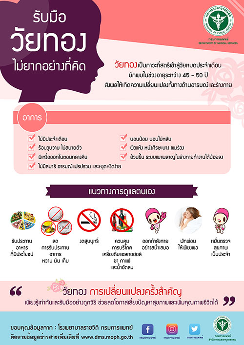 31 ม.ค.61 นายแพทย์ณรงค์ อภิกุลวณิช รองอธิบดีกรมการแพทย์ กล่าวว่า วัยทองเป็นภาวะที่สตรีเข้าสู่วัยหมดประจำเดือน มักพบในช่วงอายุระหว่าง 45 -50 ปี ส่งผลให้เกิดความเปลี่ยนแปลงทั้งทางด้านอารมณ์และร่างกาย โดยเมื่อเข้าสู่วัยทอง ร่างกายจะมีการเปลี่ยนแปลงเสมือนเป็นสัญญาณแจ้งเตือนล่วงหน้า คือ ประจำเดือนเริ่มมาคลาดเคลื่อน หรือมากะปริบกะปรอย และประจำเดือนอาจหายขาดไปกว่า 1 ปี ก่อนจะหมดประจำเดือนอย่างถาวร หลังจากที่ผู้หญิงเข้าสู่วัยทองหรือวัยหมดประจำเดือนแล้วจะเริ่มมีอาการต่าง ๆ ที่เกิดจากการเปลี่ยนแปลงของร่างกาย เช่น ไม่มีประจำเดือน ร้อนวูบวาบ ไม่สบายตัว มีเหงื่อออกในตอนกลางคืน มีปัญหาเรื่องการนอน นอนน้อย นอนไม่หลับ ผิวแห้ง หนังศีรษะบาง ผมร่วง อ้วนขึ้น ระบบเผาผลาญในร่างกายทำงานได้น้อยลง ไม่มีสมาธิ อารมณ์แปรปรวน และหงุดหงิดง่าย โดยสาเหตุเกิดจากรังไข่ไม่มีการตกไข่ ทำให้ไม่มีการผลิตฮอร์โมนเพศอย่างเอสโตรเจนและโปรเจสเตอโรนอีกต่อไป