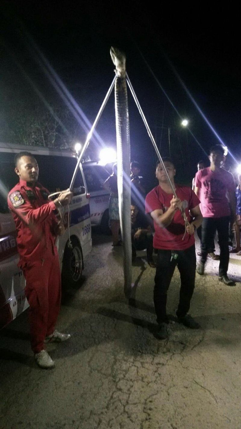 5 ก.พ.61 ผู้สื่อข่าวรายงานว่า เมื่อกลางดึกที่ผ่านมา เวลา 00.30 น. เจ้าหน้าที่อาสาสมัครกู้ภัยมังกร และเจ้าหน้าที่อาสามูลนิธิใต้เต็กตึ๊งทุ่งสง ได้รับแจ้งขอความช่วยเหลือจากนายสมชาย สุขโข อยู่บ้านเลขที่ 31 บ้านวังแห้ง หมู่ 9 ต.ถ้ำใหญ่ อ.ทุ่งสง จ.นครศรีธรรมราช ว่ามีงูจงอางขนาดใหญ่เลื้อยเข้าบ้าน ขอให้มาช่วยจับงูโดยด่วน เพราะเกรงว่าคนในบ้านจะได้รับอันตราย จึงเดินทางไปให้การช่วยเหลือ เมื่อไปถึงที่บ้านเจ้าหน้าที่ถึงกับผงะ เนื่องจากงูจงอางตัวดังกล่าวมีขนาดใหญ่มากซึ่งไม่เคยพบมาก่อน เจ้าหน้าที่จึงต้องเพิ่มความระมัดระวังมากขึ้น