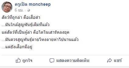 7 ก.พ.61 ครูเป็ด มนต์ชีพ ศิวะสินางกูร นักแต่งเพลงชื่อดัง โพสต์ข้อความลงในเฟซบุ๊คส่วนตัว "ครูเป็ด moncheep" แสดงความคิดเห็นหลังจากมีนักธุรกิจดังล่าสัตว์ป่าที่ตกเป็นข่าวอยู่ในขณะนี้