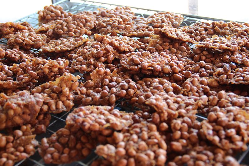 ป้าติ๋ม บอกต่ออีกว่า ในแต่ละวันจะตื่นตั้งแต่ตี 5 มาเปิดร้าน ผสมแป้งในสัดส่วนที่ลงตัวตามสูตรของตน ทิ้งไว้ ประมาณ 20 นาที จากนั้นก็จะนำถั่วลิสงที่ต้องคัดเฉพาะไซต์กลางเท่านั้น ถ้าเล็กไปไม่อร่อย ใหญ่ไปก็สุกยาก และต้องเป็นถั่วลิสงใหม่เท่านั้น จากนั้นก็นำมาคลุกเคล้าให้เข้ากันกับแป้งที่เตรียมไว้ เมื่อเข้ากันดีก็นำทัพพีตักไปเทในกระทะแรกที่ตั้งไฟอ่อนไว้ เพื่อให้ตัวแป้งจับเป็นแผ่น จากนั้นก็จะตักย้ายจากกระทะแรกไปกระทะที่ 2 ที่ตั้งไฟปานกลางไว้ ทอดประมาณ 10-20 นาที จนแป้งและถั่วสุกเหลืองพร้อมกัน จึงจะนำขึ้นไปพักให้สะเด็ดน้ำมัน และรอให้แห้งหรือเย็นสนิทก่อนจะแพ็คใส่ถุงขาย ในราคาถุงละ 20 บาท ซึ่งที่ร้านของตนจะทอดขายวันต่อวันเท่านั้นไม่มีค้างคืนเด็ดขาด ในแต่ละวันเฉลี่ยแล้วขายถั่วทอดได้วันละกว่า 100 ถุง สร้างรายได้ต่อวันไม่ต่ำกว่าวันละ 2,000 บาท