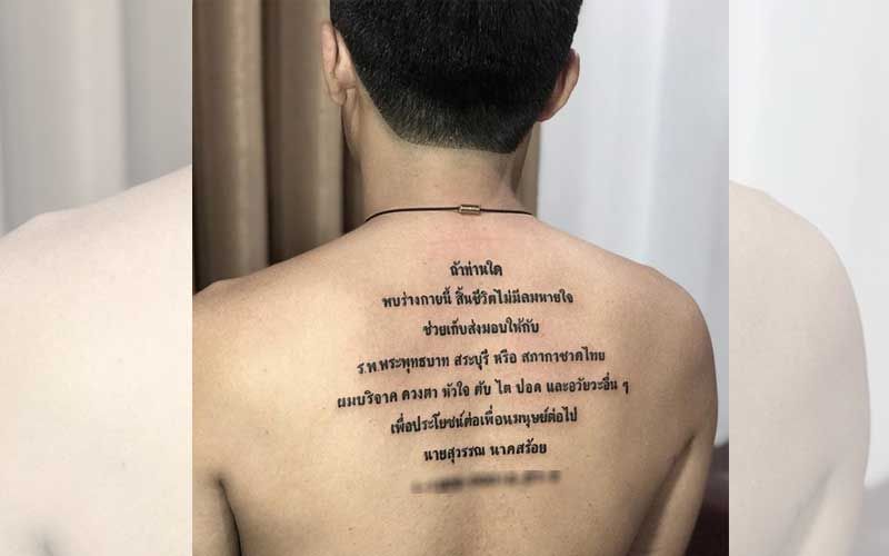 3 เม.ย. 61 ผู้ใช้เฟซบุ๊ก "Nopphadol Nakyod" ได้โพสต์เรื่องราวที่ได้รับเสียงชื่นชมจากชาวเน็ตอย่างมาก ซึ่งมีชายคนหนึ่งได้สักข้อความบนหลังของตัวเองที่ถ้อยคำ ว่า