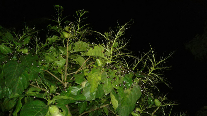ผู้สื่อข่าวจึงเดินทางไปยังบ้านของนายบุญ มะลิ อายุ 73 ปี อยู่บ้านเลขที่ 42 บ้านโคกยาง หมู่ที่ 13 ตำบลทับทัน อำเภอสังขะ จังหวัดสุรินทร์ พบว่าในช่วงหัวค่ำมีแมงอีนูน หรือแมงกีนูน มาเกาะกินใบต้นยอที่ปลูกไว้ใกล้บ้านเป็นจำนวนมากบิน โดยพากันเกาะกินจนอิ่มแล้วบินไปหลบซ่อนตัวที่อื่น และพอค่ำมืดวันต่อมาก็จะพากันบินมาเกาะกัดแทะกินอีกจนใบหมดเกลี้ยงหมดทั้งต้น