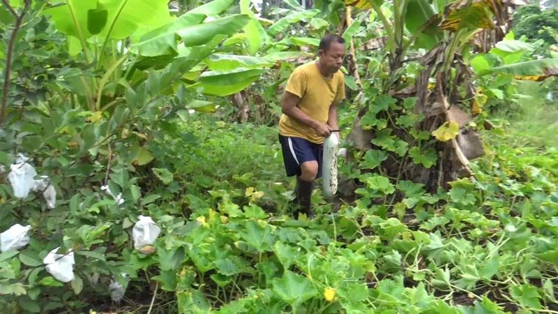 สำหรับ “สวนพอเพียง” ข้างบ้านแบบผสมผสานของ “บัณฑิต” ใช้พื้นที่ 2 ไร่ ทำเกษตรแบบผสมผสานตามแนวทฤษฎีใหม่ ปลูกฟักเขียวพันธุ์งาช้าง 400 ต้น 200 หลุม แซมกล้วยแซมฝรั่งกิมจูเต็มพื้นที่ โดยใส่ปุ๋ยน้ำชีวภาพตั้งแต่เริ่มปลูก ไม่ใช้สารเคมี ทำให้พืชผักที่ปลูกทุกชนิดจะปลอดสารพิษ เกษตรกรเจ้าของบ้านก็เก็บพืชผักกินเองด้วย เพื่อสร้างความมั่นใจให้กับลูกค้าและแม่ค้า