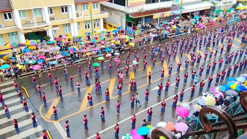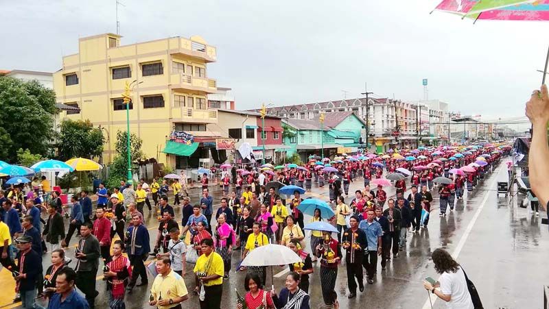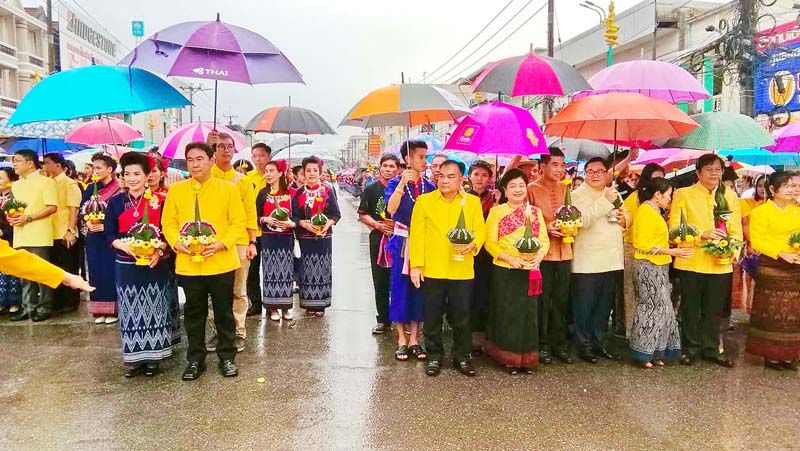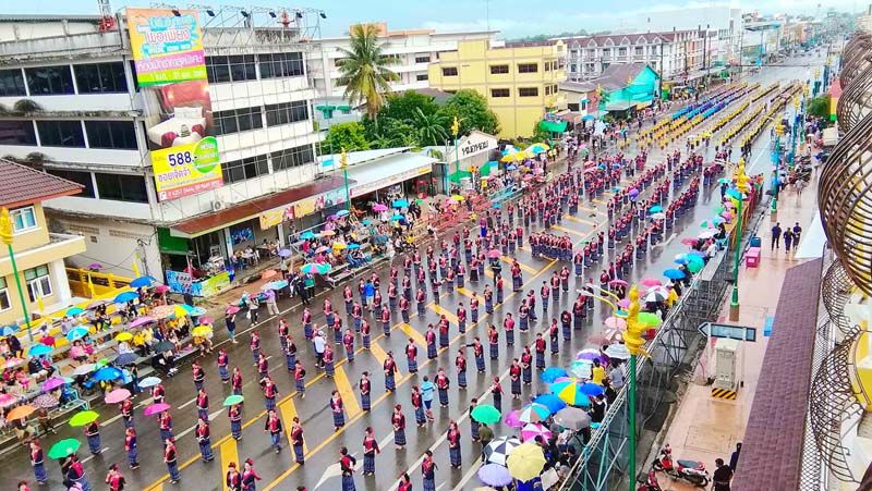 พิธีเริ่มตั้งแต่เช้าตรู่เป็นกิจกรรมทางศาสนา ด้วยการบวงสรวงพระธาตุนคร(พระธาตุประจำผู้เกิดวันเสาร์) วัดมหาธาตุ และห่มผ้าพระธาตุ สวดมนต์เสริมบารมี เป็นที่น่าสังเกตว่าตลอดทั้งวันจะมีฝนตกลงมา ทำให้เป็นปัญหาแก่เหล่านางรำกว่าพันคน ที่เดินทางมาเตรียมตัวร่วมกันปิดเมืองรำบวงสรวง ขณะที่นักท่องเที่ยวก็ไม่ยอมถอย ต่างปักหลักชมกลางแสดงท่ามกลางสายฝน