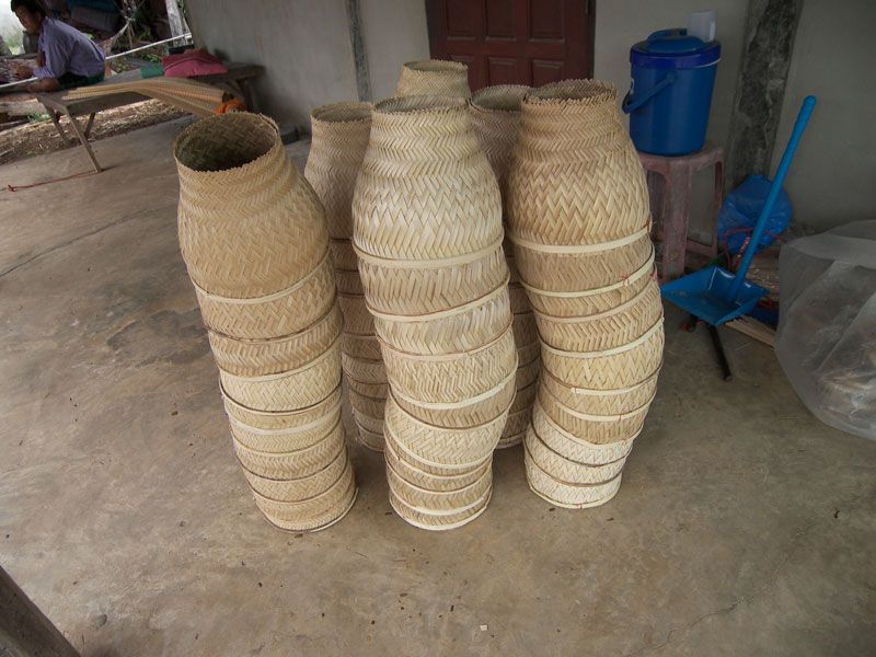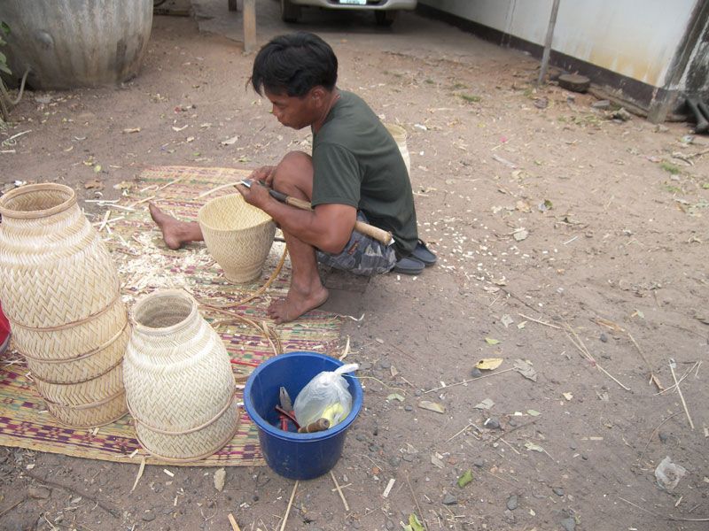 นางคำ ทองรี อายุ 50 ปี คนสู้ชีวิตบอกถึงวิธีการทำมวย ว่าอุปกรณ์ในการทำก็มี มีดจักตอก มีดโต้ เลื่อยโค้ง กบไสทำขอบ เมื่อเตรียมอุปกรณ์เสร็จแล้ว โดยเริ่มแรกต้องไปซื้อไม้ไผ่บ้านที่ จ.อุบลราชธานี ครั้งละ 50 ต้นๆละ 80 บาท จากนั้นตันเป็นท่อนๆที่ความยาว 40 เซนติเมตร แล้วทำการจักตอกเป็นเส้นๆ ต่อมานำตอกมาก่อขึ้นรูปมวย พร้อมสานเป็นลายสองและลายสามจนเป็นรูปร่างมวย และทำลักษณะเดิมอีกจนได้มวยอีกใบหนึ่ง ซึ่งมีขนาดใหญ่กว่าใบแรกแล้วสวมลงใบแรก (มวย 2 ใบ) เพื่อความทนทานแข็งแรง เสร็จแล้วนำไม้เสียวที่เตรียมไว้ประกอบที่ปากมวย ใช้ตะปูตียึดและก้นมวย แล้วนำกระแตะ(สานจากไม้ไผ่) มารองที่ก้นมวย ใช้ไม้เสียวตีขอบอีกครั้ง ตะปูยึดให้แน่น ซึ่งจะสามารถรับน้ำหนักข้าวที่นึ่งได้ดี แล้วตกแต่งให้สวยงาม