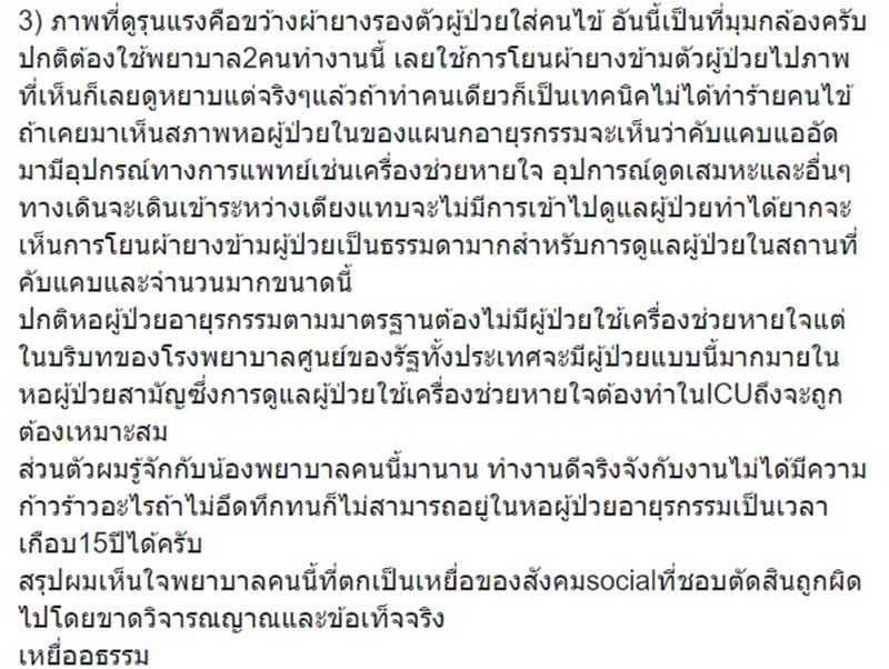 ส่วนตัวรู้จักกับพยาบาลคนนี้มานาน ทำงานดี จริงจังกับงาน ไม่ได้มีความก้าวร้าวอะไร ถ้าไม่อึด ทึก ทน ก็ไม่สามารถอยู่ในหอผู้ป่วยอายุรกรรมเป็นเวลาเกือบ 15 ปีได้ นอกจากนี้ยังเห็นใจพยาบาลคนนี้ที่ตกเป็นเหยื่อโซเชียล ที่ตัดสินถูกผิดไปโดยขาดวิจารณญาณและข้อเท็จจริง”