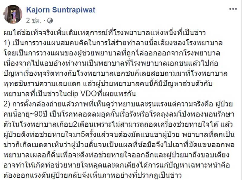 ล่าสุด โลกโซเชียลได้มีการแชร์เรื่องราวจากสมาชิกเฟซบุ๊กใช้ชื่อ "Kajorn Suntrapiwat" ของ นายขจร สุนทราภิวัฒน์ หัวหน้ากลุ่มงานผู้ป่วยนอก โรงพยาบาลพุทธชินราช จังหวัดพิษณุโลก ที่โพสต์ข้อความระบุว่า “ตนได้ข้อเท็จจริงเพิ่มเติมของเหตุการณ์ที่เกิดขึ้นว่า เป็นการวางแผนสมคบคิดในการใส่ร้าย ทำลายชื่อเสียงของโรงพยาบาล โดยผู้ช่วยพยาบาลที่ถูกไล่ออกจากโรงพยาบาล เนื่องจากไปแอบอ้างทำงานเป็นพยาบาลที่โรงพยาบาลเอกชน แล้วไปก่อปัญหาเรื่องทุจริต แล้วผู้ช่วยพยาบาลคนนี้ ก็มีปัญหาส่วนตัวกับพยาบาลที่เป็นข่าวในคลิปที่มีการเผยแพร่กัน