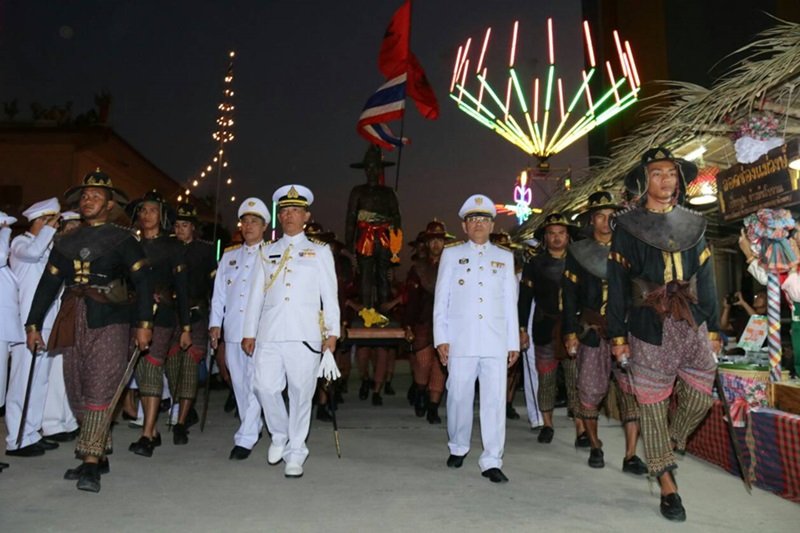 อาทิ การจัดนิทรรศการและการแสดงเทิดพระเกียรติ ตลอดจนกิจกรรมการละเล่นต่าง ๆ โดย จัดขึ้นระหว่างเวลา 16.00 - 21.00 น. ก่อนจะอัญเชิญกลับไปที่ เรือหลวงอ่างทอง เมื่อเวลา 19.00 น. ที่ผ่านมาเพื่อเตรียมยาตราทัพเข้าสู่ปากแม่น้ำเจ้าพระยาเป็นที่หมายต่อไปในวันพรุ่งนี้ ( 1 พ.ย.61) โดยเมื่อยาตรามาถึงปากแม่น้ำเจ้าพระยา จะทำการเปลี่ยนหมู่เรืออัญเชิญ จากเรือหลวงอ่างทอง เรือหลวงมันกลาง และ เรือ ต.265 เป็น เรือหลวงสีชัง และ เรือปฏิบัติการความเร็วสูง ชุดเรือ พ.51 ของหน่วยบัญชาการสงครามพิเศษทางเรือ กองเรือยุทธการ จำนวน 2 ลำ เพื่อแล่นเข้าสู่แม่น้ำเจ้าพระยา โดยมีกำหนดแวะจอดเรือ ณ ท่าเรือเสือซ่อนเล็บ ตำบลปากน้ำ อำเภอเมืองสมุทรปราการ จังหวัดสมุทรปราการ เพื่อจัดกิจกรรมเฉลิมฉลองอย่างยิ่งใหญ่ เป็นเวลา 3 วันระหว่างวันที่ 1 - 3 พฤศจิกายน 2561