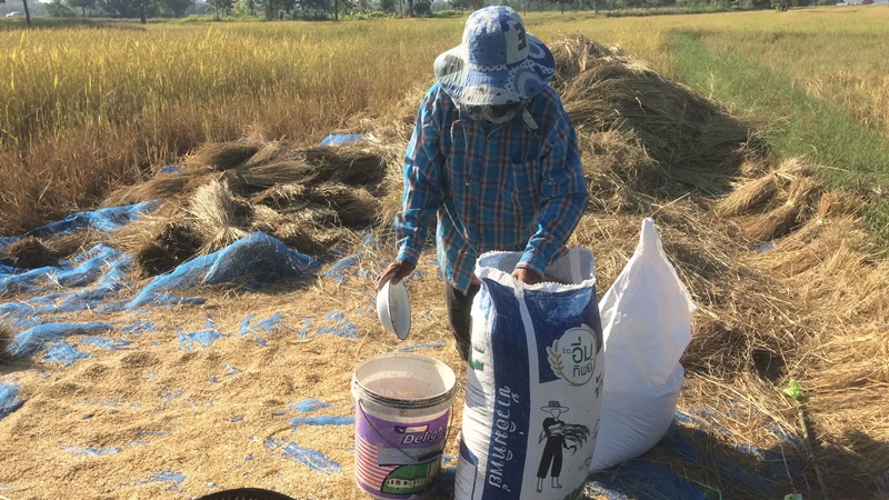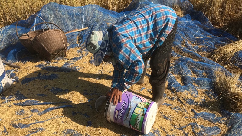 นางบัวผัน ผลคำ เล่าว่า ตนได้เก็บเกี่ยวข้าวหอมมะลิอินทรีย์ที่ปลูกไว้ โดยการใช้เคียวเกี่ยวข้าว เสร็จก็นำผ้าแยงสีเขียวมาปูเป็นลานแล้วนำข้าวรวงเป็นมัดๆ มาวางกองเอาไว้ แล้วค่อยๆ ใช้ไม้ตีรวงข้าวที่ละมัดจนออกมาเป็นเมล็ดข้าวเปลือก แล้วตักใส่กระสอบถุงปุ๋ยไปเก็บที่บ้าน