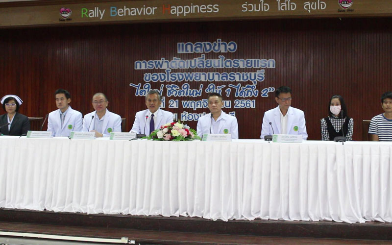 22 พ.ย.61 ที่ห้องประชุมห้องประชุมปฐมจักรี โรงพยาบาลศูนย์ราชบุรี ตำบลหน้าเมือง อำเภอเมือง จังหวัดราชบุรี นพ.ปานเนตร ปางพุฒิพงศ์ ผู้ตรวจราชการกระทรวงสาธารณสุข เขตสุขภาพที่ 5, นพ.สุริยะ คูหะรัตน์ นายแพทย์สาธารณสุขจังหวัดราชบุรี, นพ.พิเชียร วุฒิสถิรภิญโญ ผู้อำนวยการโรงพยาบาลราชบุรี, นพ.สมบูรณ์ อภิชัยยิ่งยอด รองประธานปลูกไตโรงพยาบาลราชบุรี และคุณนพมาศ สุทธิวิรัช รองผู้อำนวยการด้านการพยาบาล พร้อมด้วย ผู้ป่วยที่ได้รับการรักษาและผู้บริจาคไต ร่วมกันแถลงข่าวกรณีแพทย์สามารถผ่าตัดปลูกถ่ายไตรายแรกเป็นผลสำเร็จของโรงพยาบาลศูนย์ราชบุรีและเขตสุขภาพที่ 5 หลัง ภายหลังทีมแพทย์ได้ทำการรักษาและผ่าตัดปลูกถ่ายไต ให้ผู้ป่วยเป็นผลสำเร็จและสามารถกลับมาใช้ชีวิตตามปกติผ่านไป 20 วัน โดยร่วมกับทีมงานคณะแพทย์ศาสตร์โรงพยาบาลรามาธิบดีนำทีมโดย ทีมผ่าตัด ศัลยแพทย์ระบบปัสสาวะ ศัลยแพทย์หลอดเลือด และทีมวิสัญญีและผลจากการเฝ้าติดตามผู้ป่วยไม่พบอาการแทรกซ้อน มีชีวิตความเป็นอยู่ที่ดีขึ้น ไม่ต้องกลับมาฟอกไตเหมือนดังเดิม