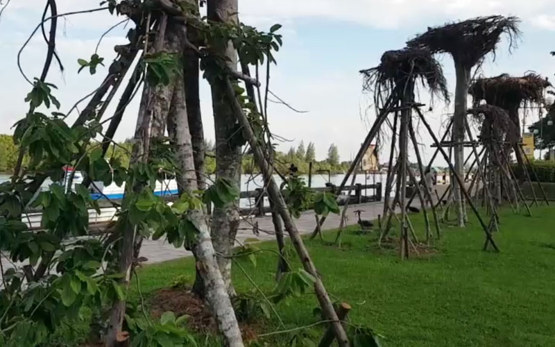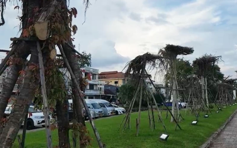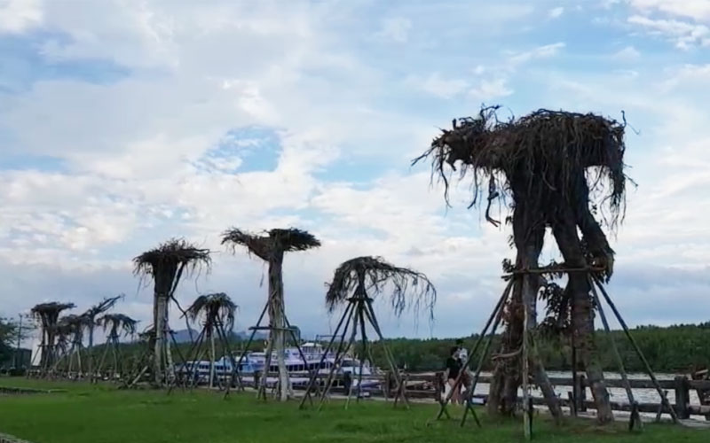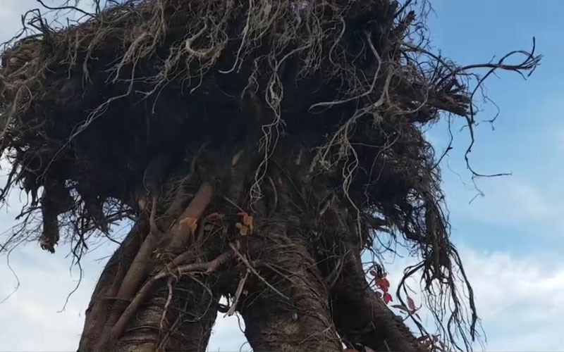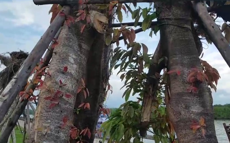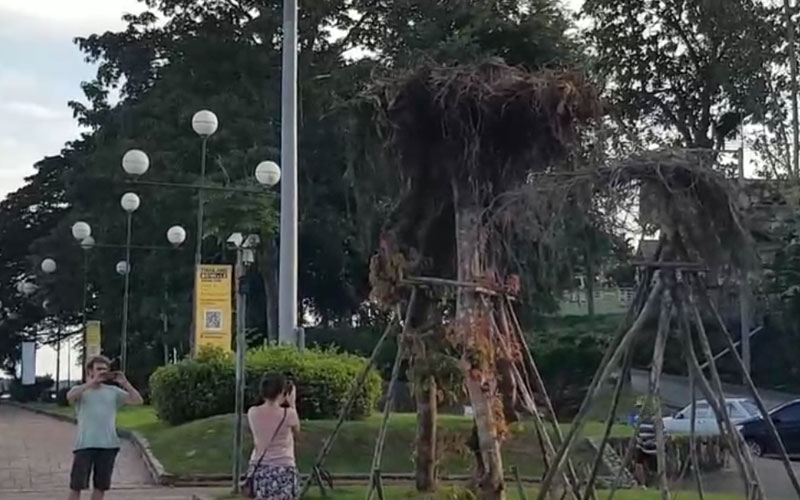 3 ธ.ค.61 ผู้สื่อข่าวรายงานว่า ที่บริเวณริมเขื่อนแม่น้ำกระบี่ ซึ่งเป็นที่ที่นำต้นไม้ จำนวน 10 ต้น สูงประมาณ 2-4 เมตร ปลูกกลับหัวโดยการนำปลายกิ่งปักลงในดิน เอาส่วนรากชูชี้ฟ้า จัดเรียงเป็นแถวอย่างเป็นระเบียบ มีนักท่องเที่ยวทั้งชาวไทย และชาวต่างชาติแวะมาเก็บภาพไว้เป็นที่ระลึกจำนวนมาก หลังพบว่าต้นไม้ที่ถูกปลูกกลับหัวนั้น กลับไม่ยืนต้นตาย ที่น่าทึ่งพบกิ่งและใบโผล่ออกมาจำนวนมาก แข่งกันชูกิ่งใบ ขึ้นสู่ท้องฟ้ารับแสงแดด กลายเป็นแลนมาร์คแห่งใหม่หน้าเมือง โดยเฉพาะชาวต่างชาติอดใจไม่ได้ที่จะต้องเชลฟี่กับต้นไม้ดังกล่าว