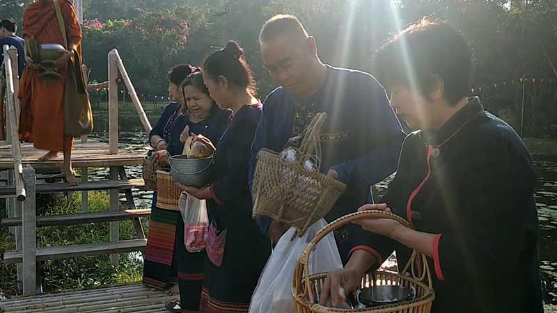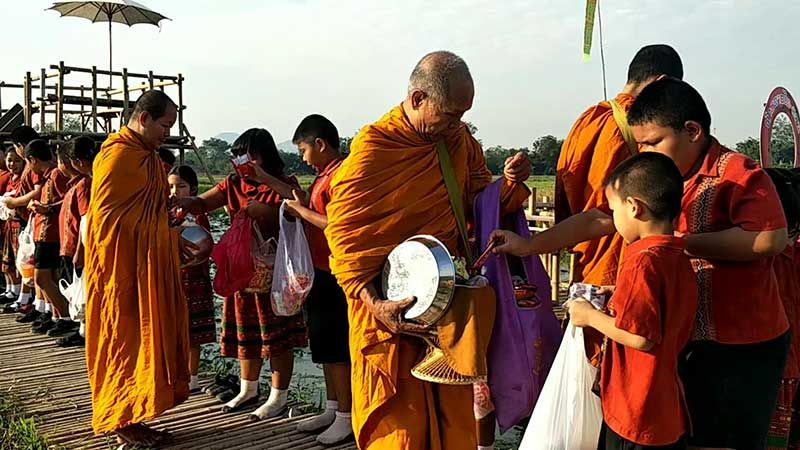 โดยไฮไลท์ที่นี่จะอยุ่ในช่วงเช้าเวลาประมาณ 06.00 น. พระภิกษุสงฆ์จะเดินลงมาบิณฑบาตรบนสะพานไม้ไผ่ที่ทอดยาวกลางบึงทุ่งบัวขาวและบัวแดงที่เบ่งบานสะพรั่งรับแสงอาทิตย์ในช่วงยามเช้าเต็มท้องทุ่ง นักท่องเที่ยวที่เดินทางมาพักผ่อนตามที่พักหรือรีสอร์ทใกล้ๆ จะได้เข้ามาร่วมกันทำบุญตักบาตรรพร้อมกับชาวบ้าน และมีการแสดงการร่ายรำของชาวบ้านชุมชนวัดนาหนองควบคู่กันไปด้วย