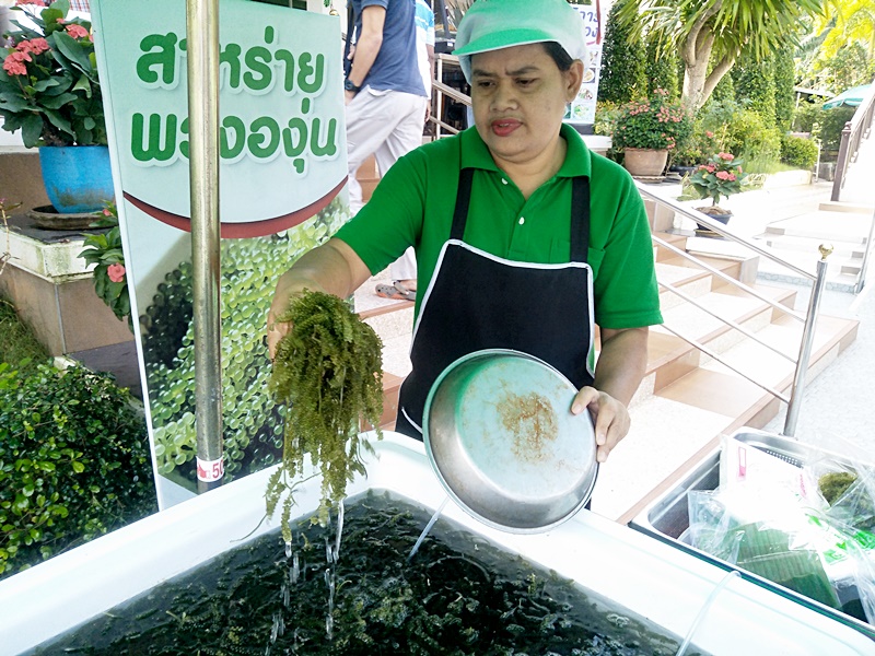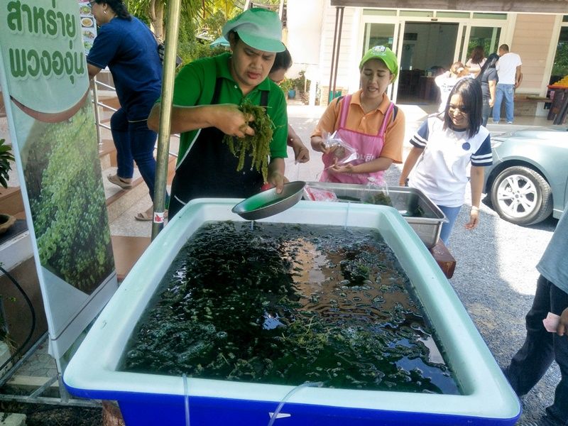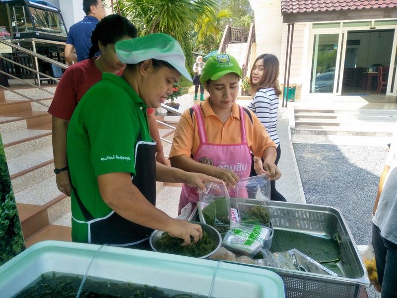 จากนั้น เดินทางไปพบกับนางวัลลี เสริมศักดิ์ อายุ 42 ปี ที่บ้านเลขที่ 201 หมู่ 3 ต.แหลมสัก ซึ่งที่บ้านของนางวัลลี จัดตั้งเป็นกลุ่มวิสาหกิจชุมชนเพาะเลี้ยงและแปรรูป สาหร่ายพวงองุ่น พบกลุ่มชาวบ้าน กำลังช่วยกันเร่งคัดแยกสาหร่ายพวงองุ่น เตรียมนำส่งขายในช่วงเทศกาลปีใหม่ สอบถามนางวัลลี ได้ข้อมูลว่า ตามที่ได้ศึกษาพบว่าสาหร่ายพวงองุ่น เดิมเป็นสาหร่ายที่มีต้นกำเนิดมาจากประเทศญี่ปุ่น จากนั้นมีการนำมาเพาะเลี้ยงที่ จ.เพชรบุรี ก่อนที่ตัวนางวัลลี ได้ลองกินและชอบ จึงลองนำมาเพาะเลี้ยงที่กระชังปลาของตัวเองในพื้นที่ ต.แหลมสัก โดยแรกทีเดียวทำอาชีพเลี้ยงปลากระชังส่งขาย ส่วนสาหร่ายช่วงแรกเพียงนำมาเพาะเลี้ยงเล่นๆ แต่ปรากฎว่าเลี้ยงแล้วเจริญเติบโตดี จึงลองนำออกมาขายตามตลาดนัด จนผู้คนที่ได้ลองกินพากันถูกใจ สั่งซื้อกันจนผลิตแทบไม่ทัน