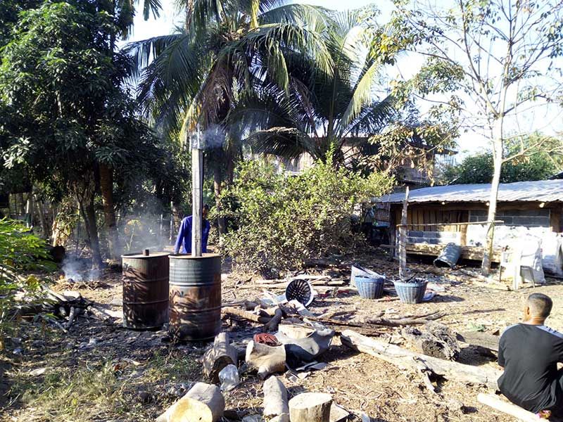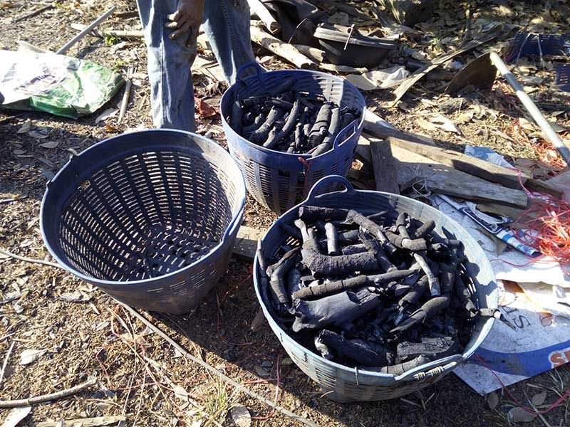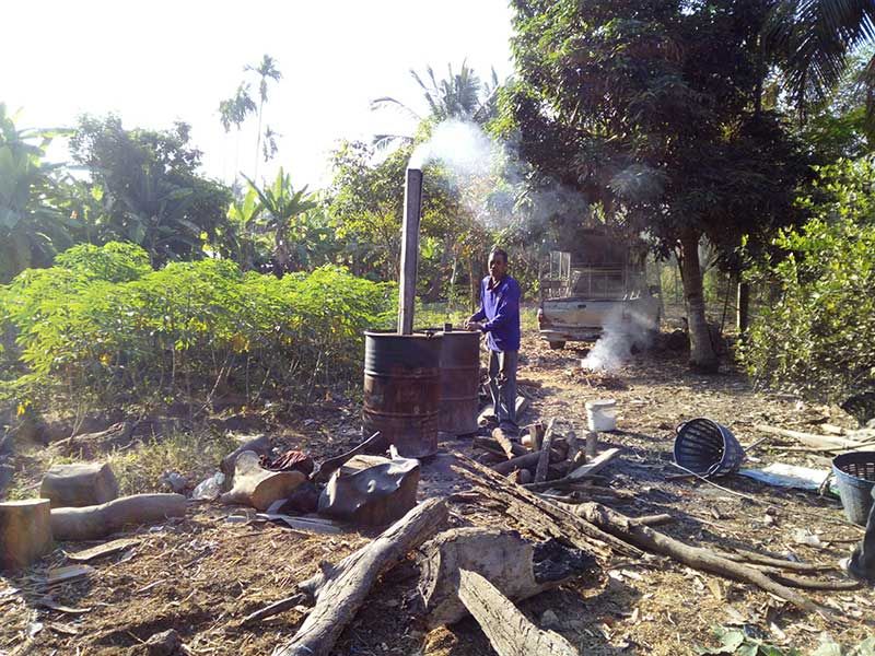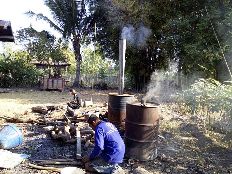 นายลำดวน ที่ดี วัย 60 ปี อยู่บ้านเลขที่ 58 ม.9 ต.เทพรักษา อ.สังขะ จ.สุรินทร์ เปิดเผยว่า ตนมีสวนยางพาราอยู่กว่า 10 ไร่ ในปีนี้ปิดหน้ายางเร็วกว่าทุกปี เนื่องจากแล้งมากทำให้ต้นยาพาราแห้งเหี่ยวใบร่วงหล่นเร็ว จำเป็นต้องหยุดกรีดยางเพื่อรักษาต้นยางและให้ต้นยางมีเวลาพักตัว 2 -3 เดือนก่อนจะลงมือกรีดอีกทีช่วงต้นพฤษภาคม ทำให้ตนเองขาดรายได้ จึงคิดค้นนำกิ่งไม้ยางพาราที่หักตกหล่นอยู่ในสวนมาเผาถ่าน ช่วงแรกๆใช้วิธีเผาแบบใช้แกลบกลบเป็นกองพูน ตนคิดว่าไม่คุ้มค่าเพราะควันเยอะจะรบกวนเพื่อนบ้านและใช้ในการเผานานเป็นสัปดาห์กว่าจะได้ถ่านแต่ละก้อน