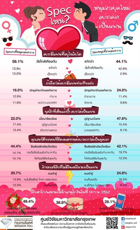 วันวาเลนไทน์ปีนี้ กรุงเทพโพลล์โดยศูนย์วิจัยมหาวิทยาลัยกรุงเทพ สำรวจความคิดเห็นของประชาชนในเรื่อง “Spec ไหน? หนุ่มสาวยุคใหม่อยากควงเป็นแฟน” โดยเก็บข้อมูลจากหนุ่มสาวที่มีอายุ 15-35 ปี ในเขตกรุงเทพฯ และปริมณฑล จำนวน 1,191 คน พบว่า