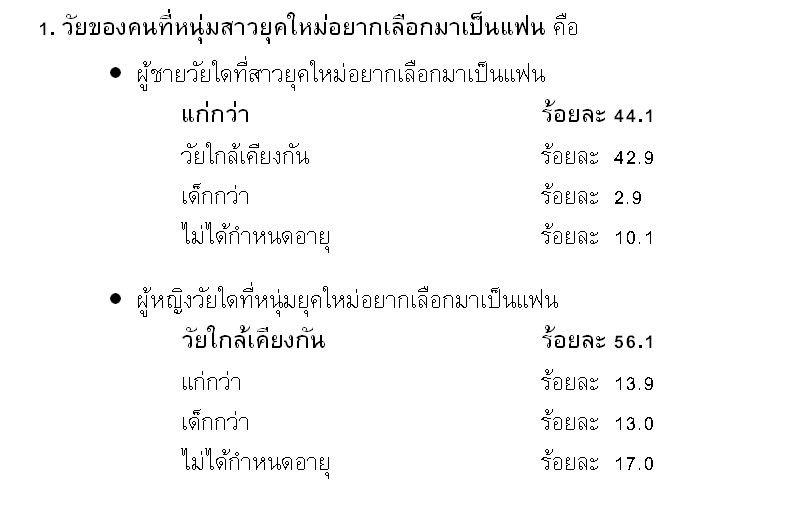 สาวๆ ยุคใหม่ร้อยละ 44.1 ระบุว่าอยากมีแฟนอายุมากกว่า ขณะที่หนุ่มๆ ส่วนใหญ่ร้อยละ 56.1 อยากมีแฟนอยู่ในวัยเดียวกัน และคิดเห็นเหมือนกันว่าอยากมีแฟนเป็นนักธุรกิจ /เจ้าของกิจการ