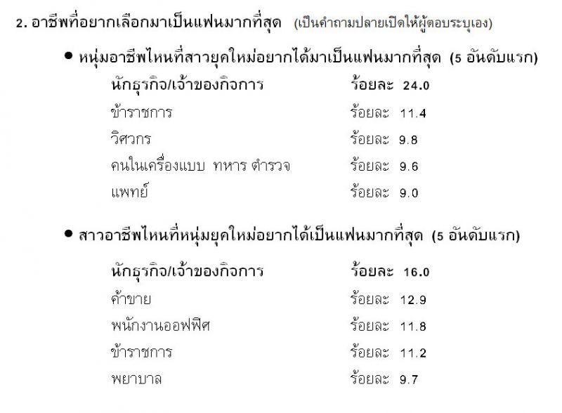 เมื่อถามว่าอยากมีแฟนทำอาชีพอะไร พบว่า ผู้หญิงส่วนใหญ่ ร้อยละ 24.0 ระบุอยากมีแฟนเป็นนักธุรกิจและเจ้าของกิจการ รองลงมาร้อยละ 11.4 ระบุว่าอยากมีแฟนรับราชการ ทั้งนี้ผู้ชายส่วนใหญ่ร้อยละ 16.0 ระบุว่าอยากมีแฟนเป็นเป็นนักธุรกิจและเจ้าของกิจการเช่นกัน รองลงมาร้อยละ 12.9 ระบุว่าอยากมีแฟนอาชีพค้าขาย