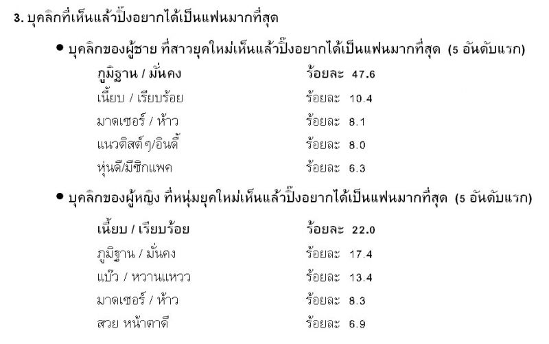 ทั้งนี้สาวๆส่วนใหญ่ร้อยละ 47.6 ชอบผู้ชายที่ดูภูมิฐานมั่นคง ขณะที่หนุ่มๆ ชอบผู้หญิงที่ดูเนี้ยบเรียบร้อย โดยมีความเห็นเหมือนกันว่าอยากแต่งงานกับคนที่ซื่อสัตย์ รักเดียวใจเดียว และไม่อยากได้คนเจ้าชู้มาเป็นแฟน