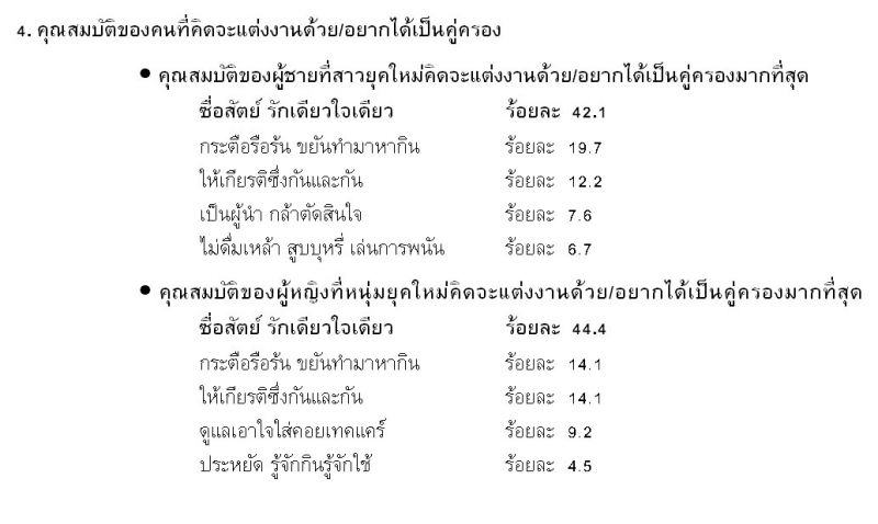 ส่วนคุณสมบัติของคนที่คิดจะแต่งงานด้วยหรืออยากได้เป็นคู่ครองนั้น ผู้หญิงส่วนใหญ่ร้อยละ 42.1ระบุว่าต้องเป็นผู้ชายซื่อสัตย์ รักเดียวใจเดียว รองลงมาร้อยละ 19.7 ต้องเป็นคนกระตือรือร้น ขยันทำมาหากิน เช่นเดียวกับความเห็นของเพศชายที่ส่วนใหญ่ร้อยละ 44.4 ระบุว่าต้องเป็นผู้หญิงซื่อสัตย์ รักเดียวใจเดียว รองลงมาร้อยละ 14.1 ระบุว่าต้องเป็นคนกระตือรือร้น ขยันทำมาหากิน