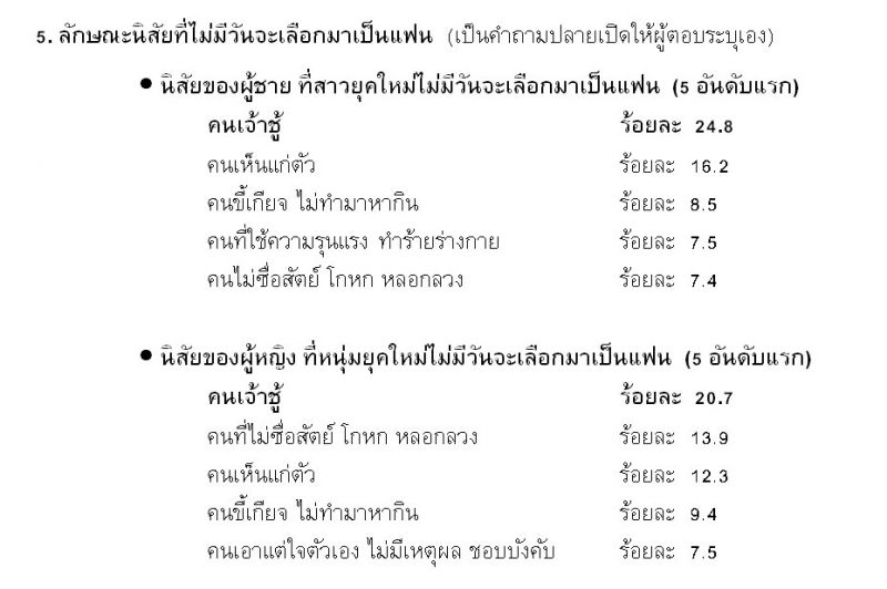 เมื่อถามถึงลักษณะนิสัยที่ไม่อยากได้เป็นแฟน พบว่า ผู้หญิงส่วนใหญ่ร้อยละ 24.8 ระบุว่าผู้ชายเจ้าชู้ รองลงมาร้อยละ 16.2 ระบุว่าเป็นคนเห็นแก่ตัว ขณะที่เพศชายส่วนใหญ่ร้อยละ 20.7 ระบุว่าผู้หญิงเจ้าชู้ รองลงมาร้อยละ 13.9 ระบุว่า เป็นคนที่ไม่ซื่อสัตย์ โกหก หลอกลวง