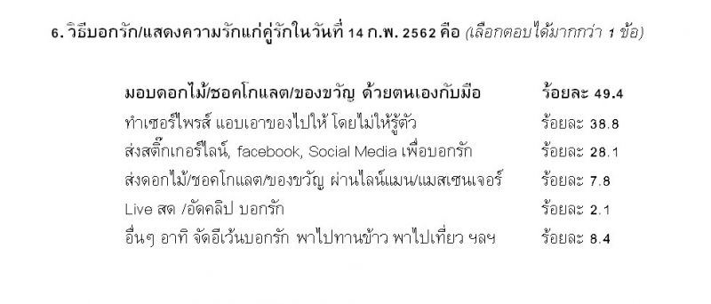 สำหรับวิธีบอกรัก/แสดงความรักในวันวาเลนไทน์ปีนี้หนุ่มสาวส่วนใหญ่ร้อยละ 49.4 ระบุว่าจะมอบดอกไม้/ชอคโกแลต/ของขวัญ ด้วยตนเองกับมือ รองลงมาร้อยละ 38.8 ระบุว่าจะทำเซอร์ไพรส์ แอบเอาของไปให้ โดยไม่ให้รู้ตัว และร้อยละ 28.1 ระบุว่าจะส่งสติ๊กเกอร์ไลน์, facebook, Social Media เพื่อบอกรัก ดังรายละเอียดต่อไปนี้