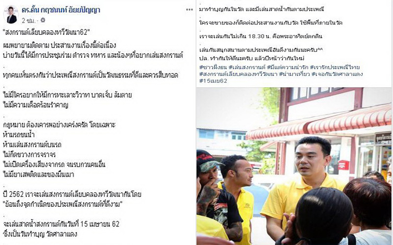 “ปี 2562 เราจะเล่นสงกรานต์เลียบคลองทวีวัฒนากัน โดยย้อนถึงจุดกำเนิดของประเพณีสงกรานต์ที่ดีงาม จะเล่นสาดน้ำสงกรานต์กันวันที่ 15 เมษายน 62 ซึ่งเป็นวันทำบุญ วัดศาลาแดง มาทำบุญกันในวัด และมีเล่นสาดน้ำกันตามประเพณี ใครจะขายของก็ติดต่อประสานงานกับวัด ใช้พื้นที่ภายในวัด เราจะเล่นกันไม่เกิน 18.30 น. คือพระอาทิตย์ตกดิน เล่นกันสนุกสนานตามประเพณีอันดีงามกันนะครับ ปล. ทำกันให้ดีนะครับ แล้วปีหน้าว่ากันใหม่”