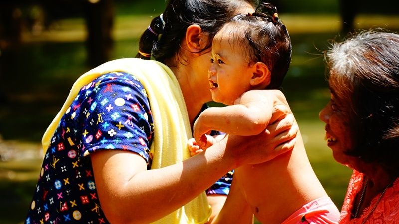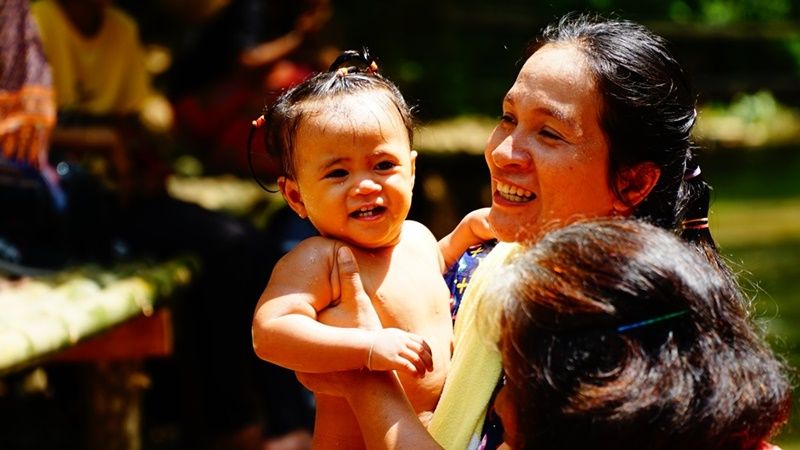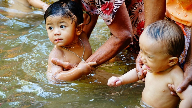 พร้อมทั้งผู้สูงอายุได้ร่วมกันทำพิธีนำเด็กแรกเกิดในหมู่บ้านอุ้มลงไปในลำคลอง เพื่อให้เด็กแรกเกิดอายุ 3 เดือนขึ้นไปได้สัมผัส น้ำธรรมชาติ หรือน้ำคลองแห่งชีวิต เพื่อให้พระแม่คงคาช่วยคอยปกปักรักษา และเป็นการบอกกล่าวให้สายน้ำได้รับรู้