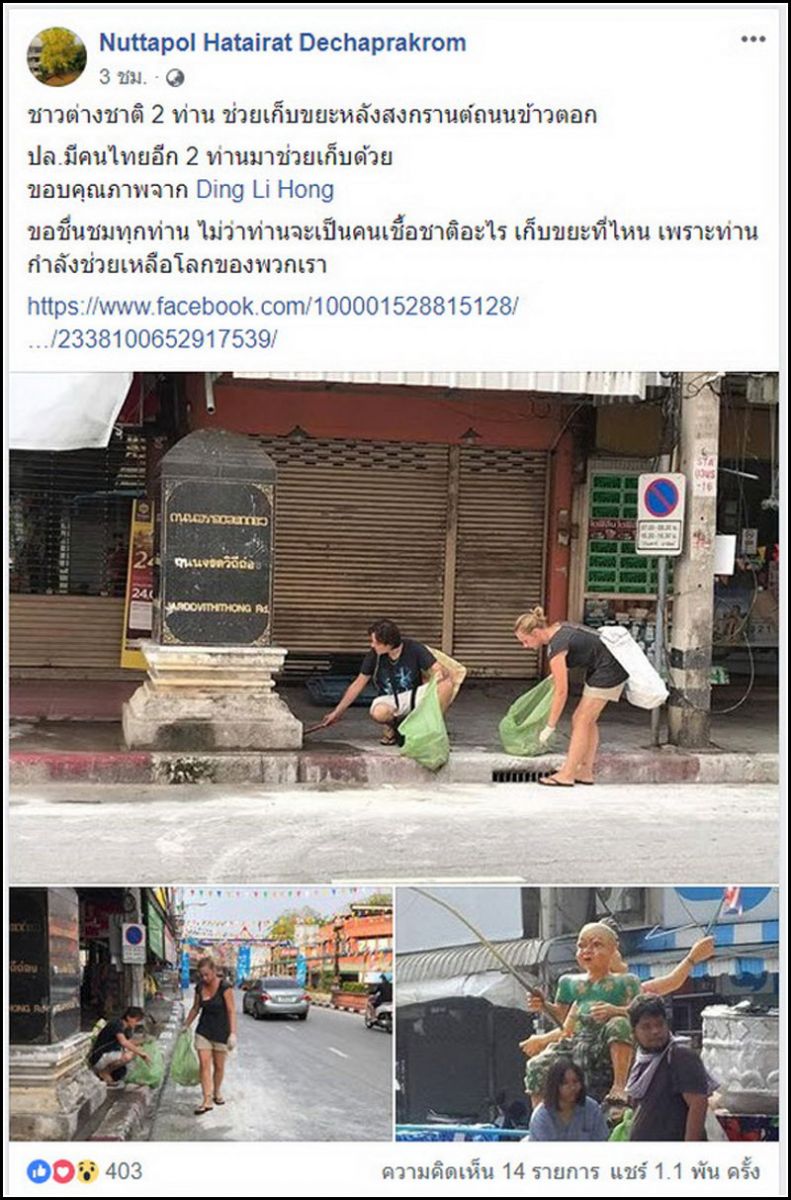 หลังจากผู้ใช้เฟซบุ๊กนามว่า Aof Siri Sotthiworakul และ Nuttapol Hatairat Dechaprakrom ได้มีการเผยแพร่ภาพความน่ารักประทับใจของนักท่องเที่ยวคู่นี้ พร้อมโพสต์ข้อความระบุ “ชาวต่างชาติ 2 ท่าน ช่วยเก็บขยะหลังสงกรานต์ถนนข้าวตอก ปล.มีคนไทยอีก 2 ท่านมาช่วยเก็บด้วย ขอชื่นชมทุกท่าน ไม่ว่าท่านจะเป็นคนเชื้อชาติอะไร เก็บขยะที่ไหน เพราะท่านกำลังช่วยเหลือโลกของพวกเรา” จนทำให้มีการแชร์ต่ออีกจำนวนมาก พร้อมกับกล่าวขอบคุณและชื่นชมในความมีน้ำใจ