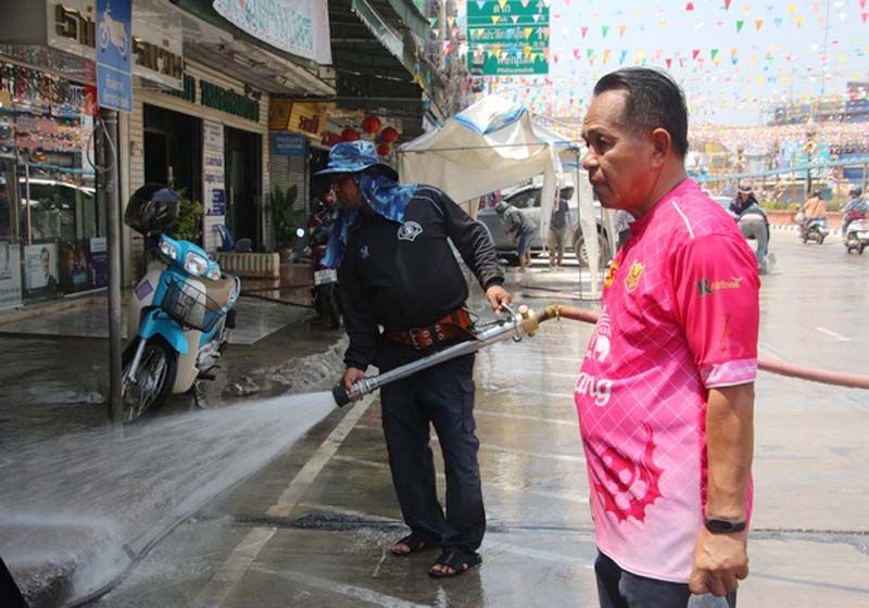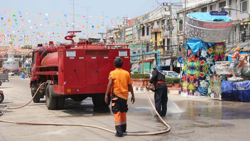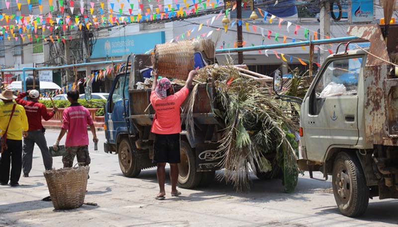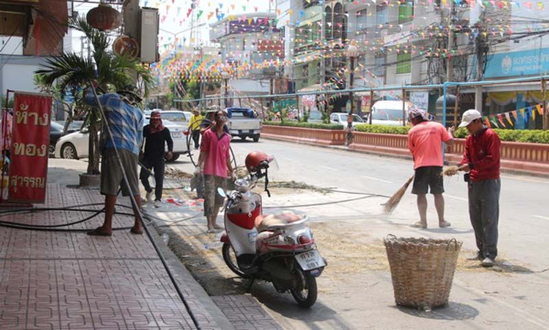 ขณะเดียวกันอีกฝั่งถนนตรงข้ามกัน ทางด้านนายอธิราช วรรณา รองนายกเทศมนตรีเมืองสุโขทัยธานี พร้อมด้วยเจ้าหน้าที่กองช่าง เจ้าหน้าที่งานป้องกันและบรรเทาสาธารณภัย เจ้าหน้าที่กองสาธารณสุขและสิ่งแวดล้อม ก็ได้ทำการเร่งเคลียร์พื้นที่เก็บเต็นท์ กวาดเศษขยะ กองฟาง ฉีดน้ำล้างคราบโคลน คราบแป้ง และทำความสะอาดถนน บริเวณที่จัดงานสงกรานต์เสื้อลายดอก ถนนข้าวตอกสุโขทัย เพื่อให้กลับคืนสู่สภาพปกติโดยเร็ว