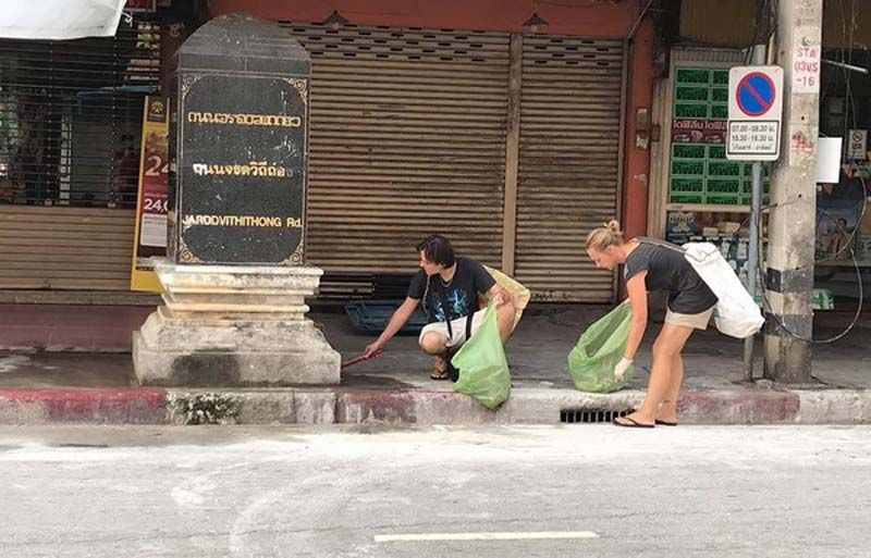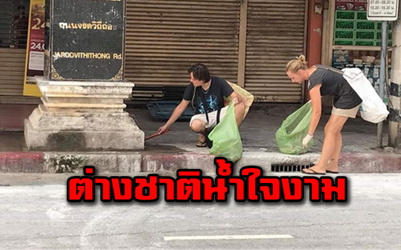 โลกออนไลน์แห่ชื่นชม 2 นักท่องเที่ยวต่างชาติเดินหิ้วถุงช่วยเก็บขยะ หลังจบสงกรานต์ถนนข้าวตอกสุโขทัย